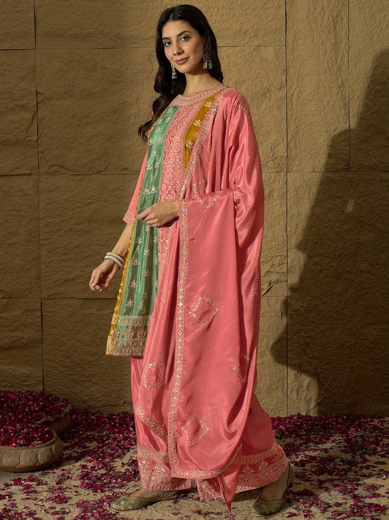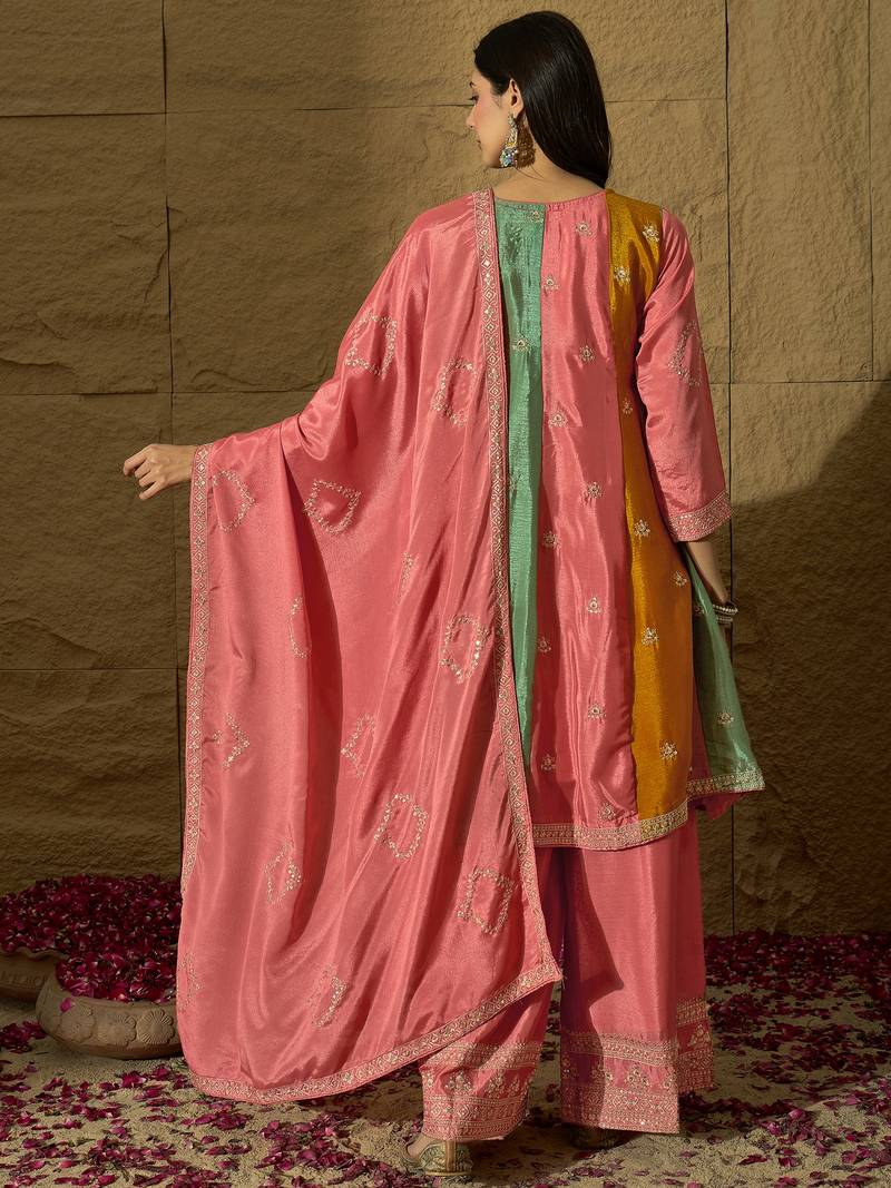 Saahmriga embroidered peach chinon round neck regular sleeve kurta palazzo sets stitched