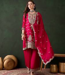 | Product Name | Saahmriga Embroidered Pink Vichitra Silk Round Neck Regular Sleeve Kurta Palazzo Sets | |