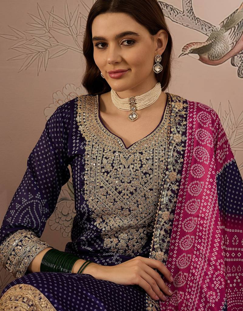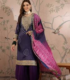 Saahmriga embroidered purple chinon notch neck regular sleeve kurta palazzo sets stitched