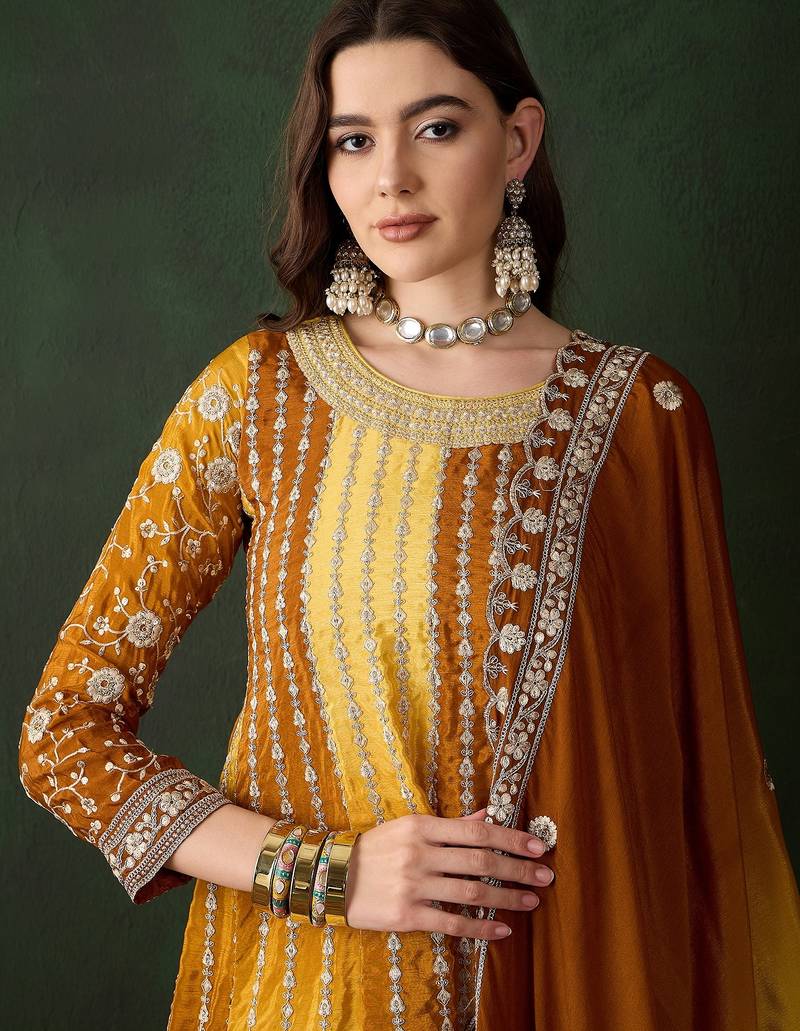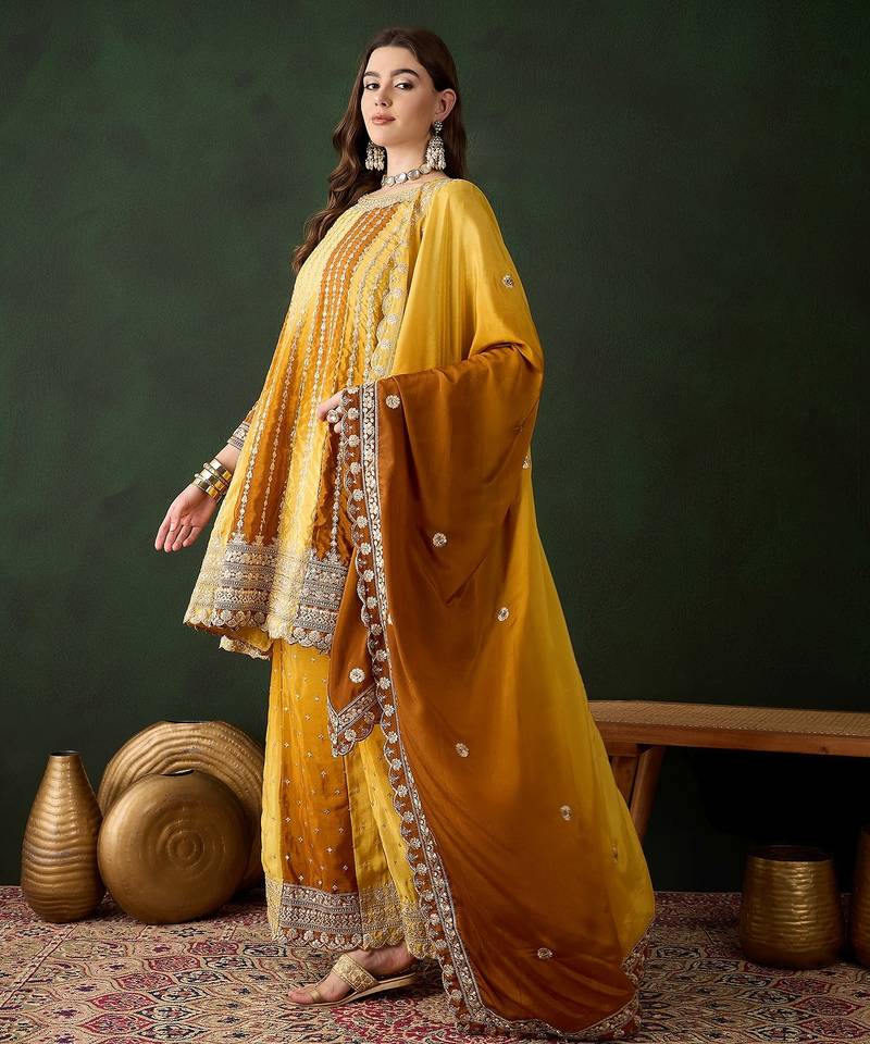 | Product Description | Bright Yellow Kurta Sharara Set Crafted In Premium Chinon Fabric For A Festive Vibe. Flared Stitched Kurta With Embroidery, Designed In A Flattering 42 Inch Length. Coordinated Stitched Sharara Bottom Offering Comfort And Graceful Flow. Matching Embroidered Chinon Dupatta With A 2.15 Meter Length. Perfect For Festivals, Daytime Events, Haldi Functions, And Celebrations. |
