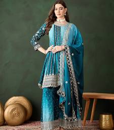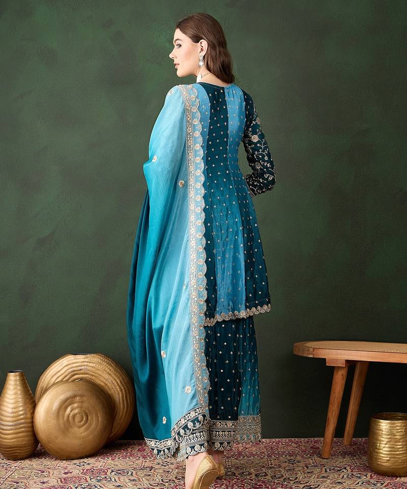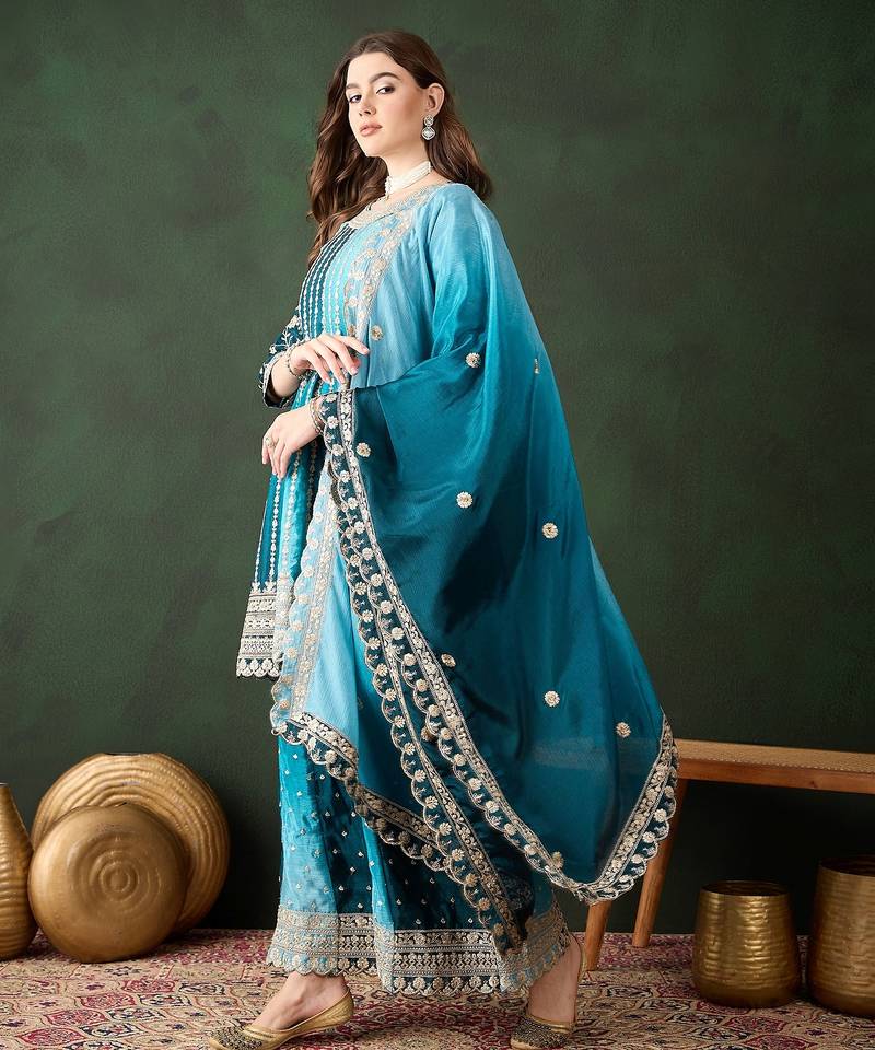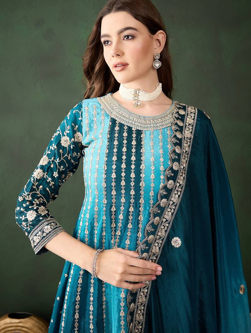 | Product Description | Stylish Blue Flared Kurta Made From Premium Chinon Fabric. Embroidered Detailing Adds An Elegant Festive Touch. Comfortable Stitched Sharara Enhances Movement And Style. Lightweight 2.15 M Embroidered Dupatta Completes The Outfit. Perfect For Festive Functions, Parties, And Celebrations. |