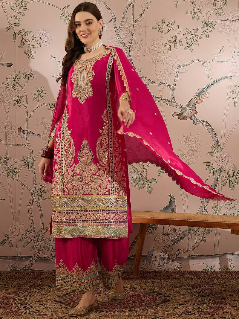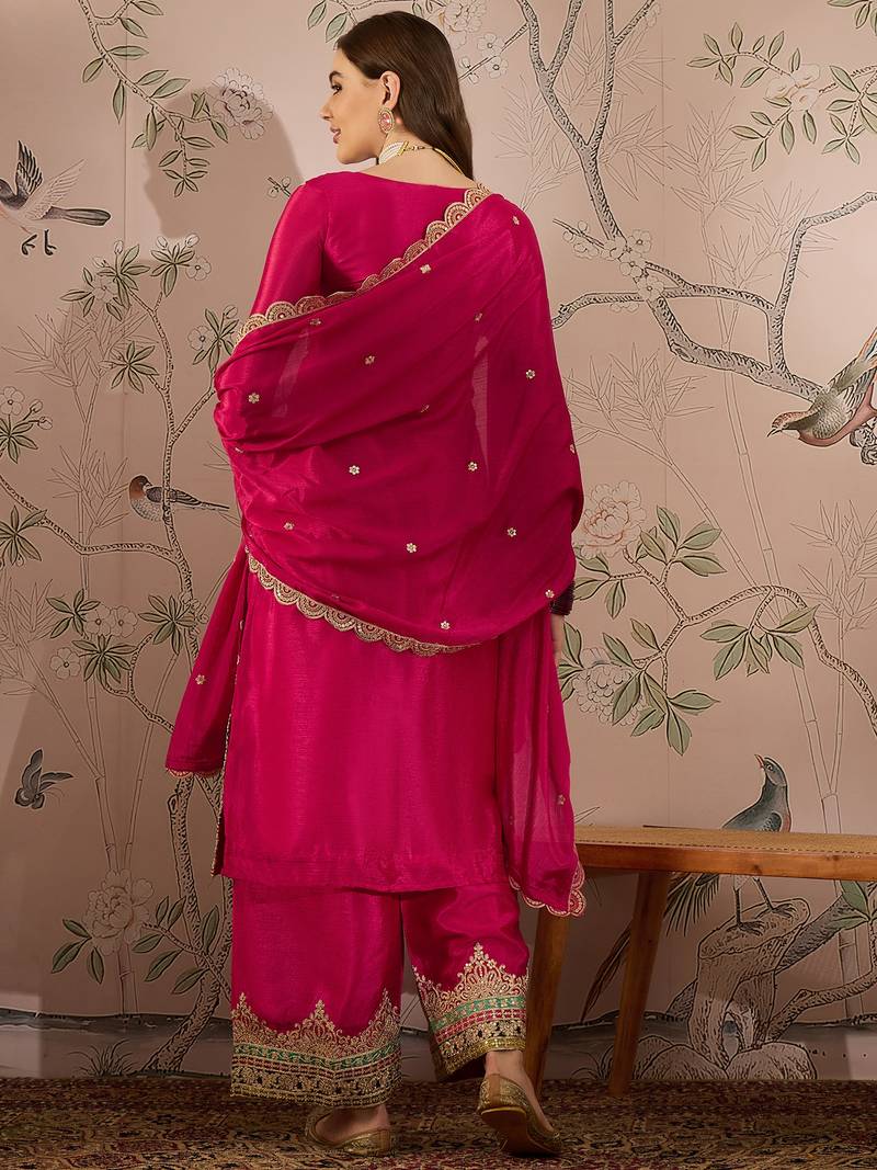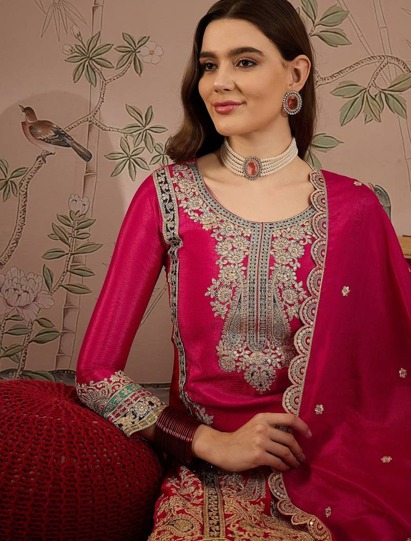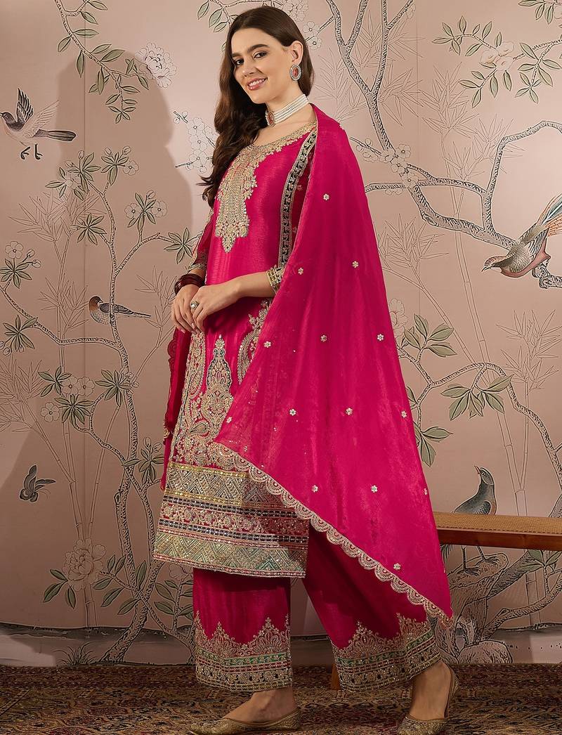 | Product Description | Beautiful Pink Straight Kurta With Detailed Embroidery Work. Smooth Chinon Fabric Gives A Premium Festive Drape. Palazzo With Santoon Inner Ensures Comfortable Long Wear. Lace Bordered Dupatta Adds A Delicate And Elegant Touch. Great For Weddings, Festive Functions, And Cultural Gatherings. |