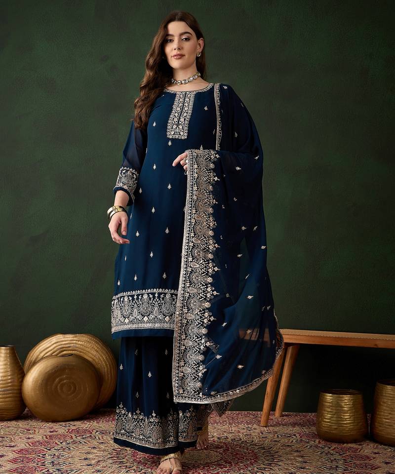 | Product Description | Stylish Rama Straight Kurta With Intricate Embroidery For Festive Charm. Lightweight Faux Georgette Fabric For All Day Comfort. Flared Sharara Bottom With Santoon Inner Adds A Graceful Silhouette. Embroidered Dupatta Enhances The Complete Ethnic Look. Ideal For Sangeet, Festive Gatherings, And Special Functions. |