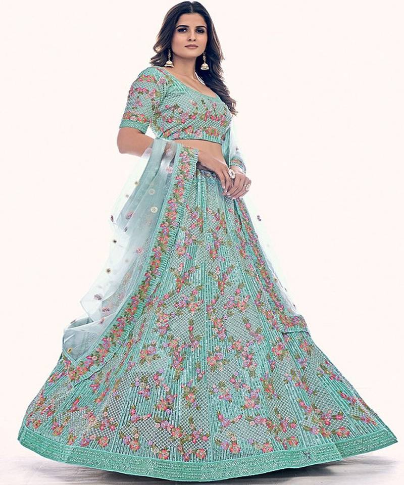 Floral embroidered net semi stitched lehenga & blouse with dupatta