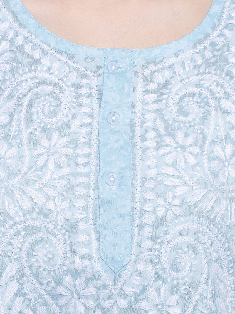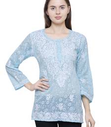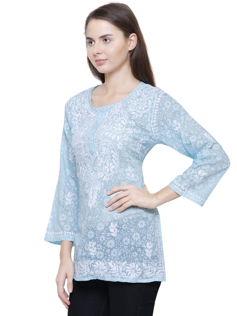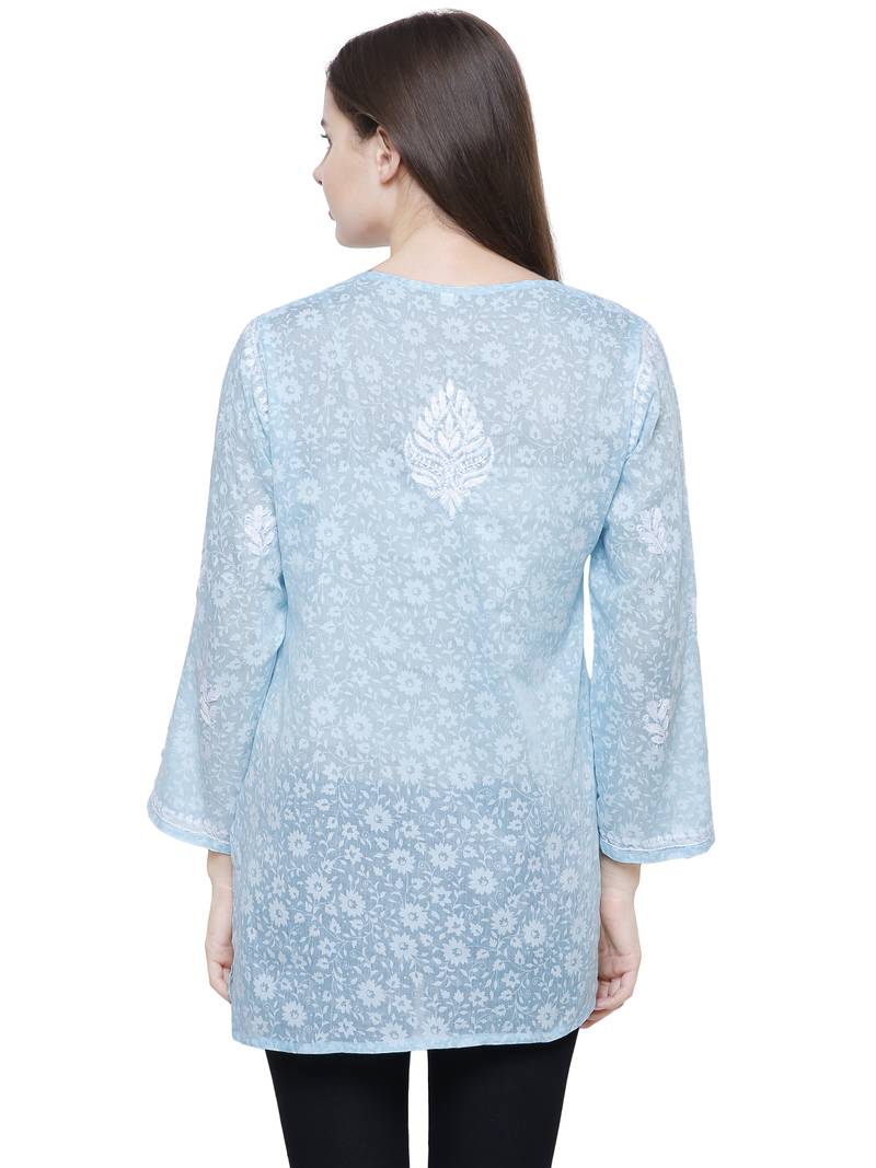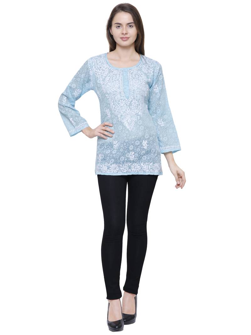 Beautifully Designed Brasso Printed Tops For Women Which Has Fabulous Embroidery All Over The Neck And Bottom Side Of Top Which Makes Tops More Beautiful. It Has 3/4th Sleeves Which Also Looks Elegant And Can Keep You Run With This Summer.Blue Color Brasso Printed Top With Embroidery All Over The Neck Brasso Printed Emroidered Chikankari Tops For Women