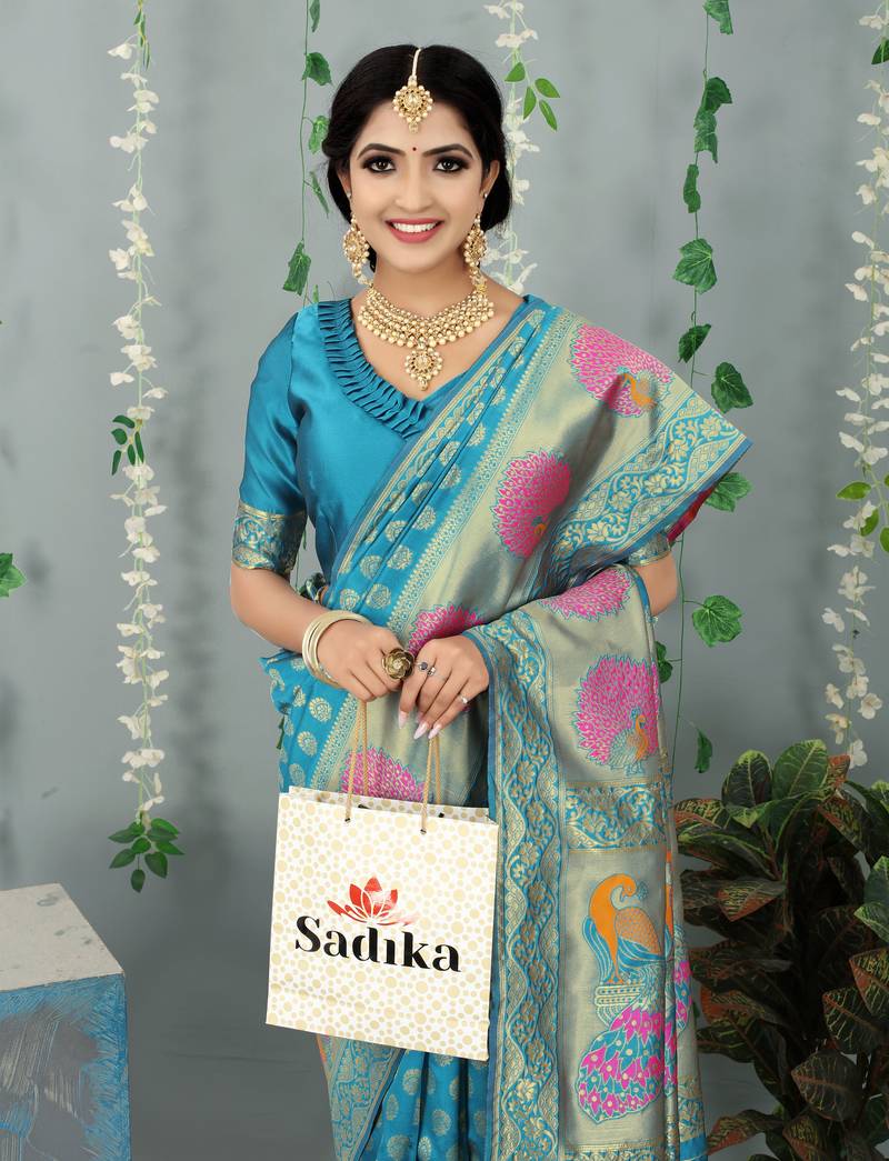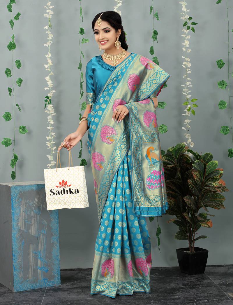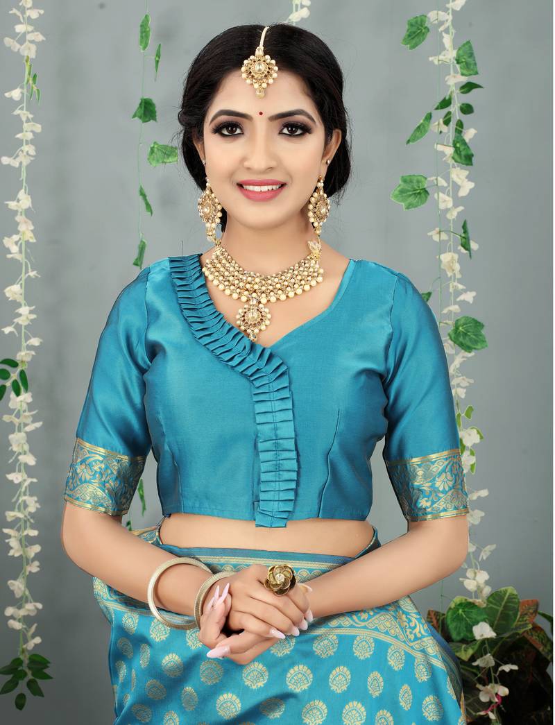 Aqua blue woven banarasi silk saree with blouse