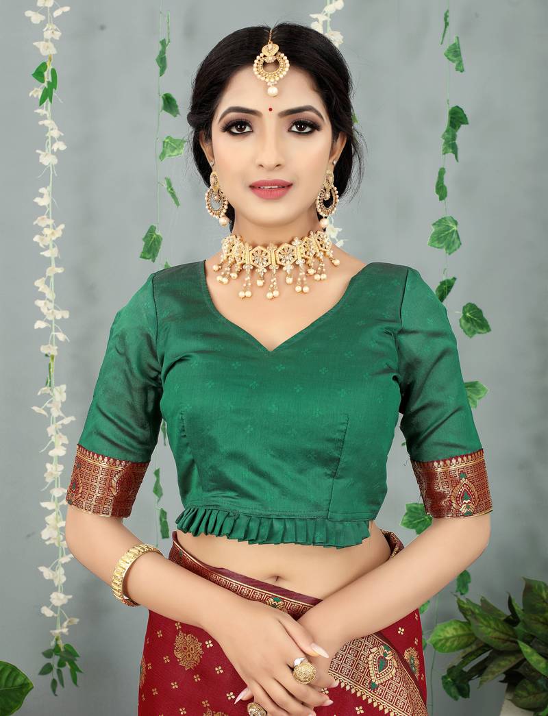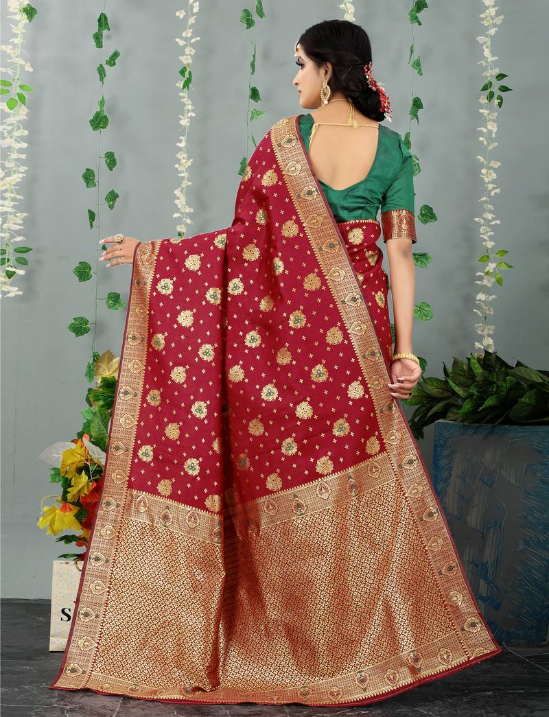 Maroon woven banarasi silk saree with blouse