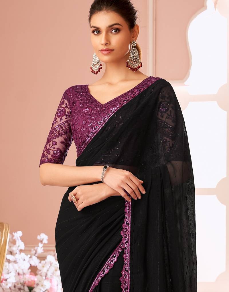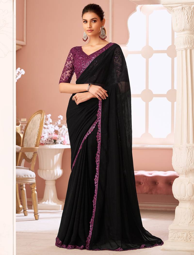 Black georgette designer lace border saree with heavy work blouse for wedding party