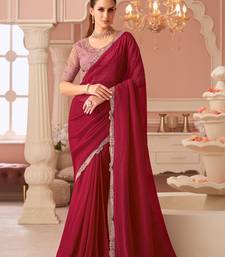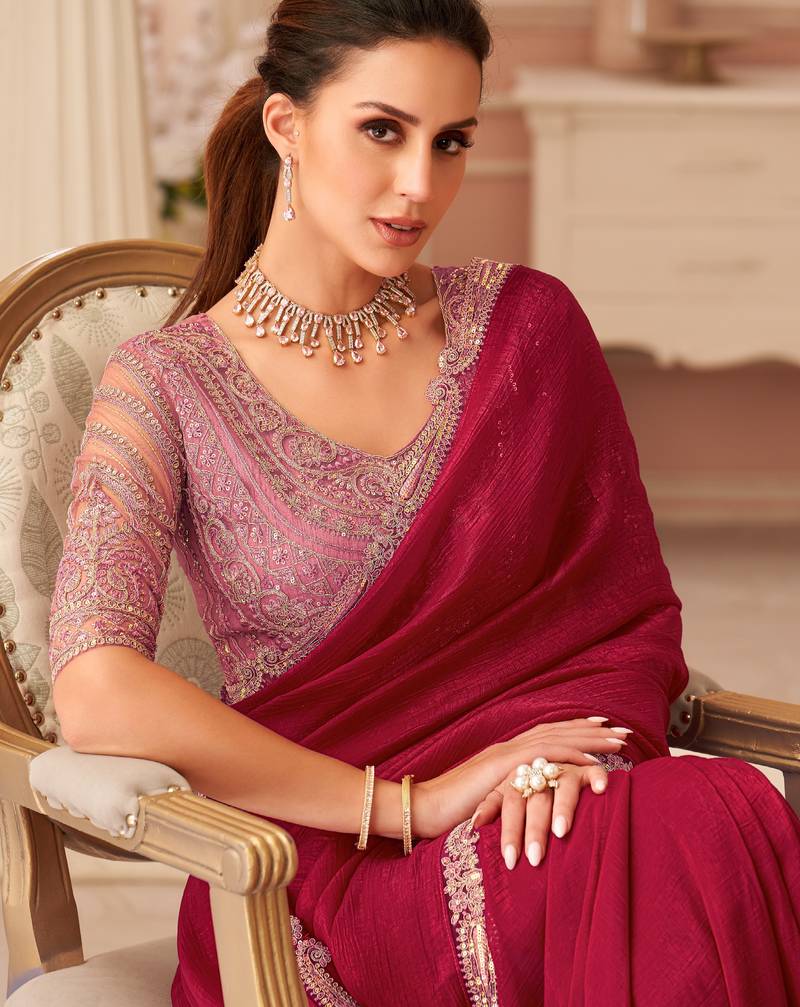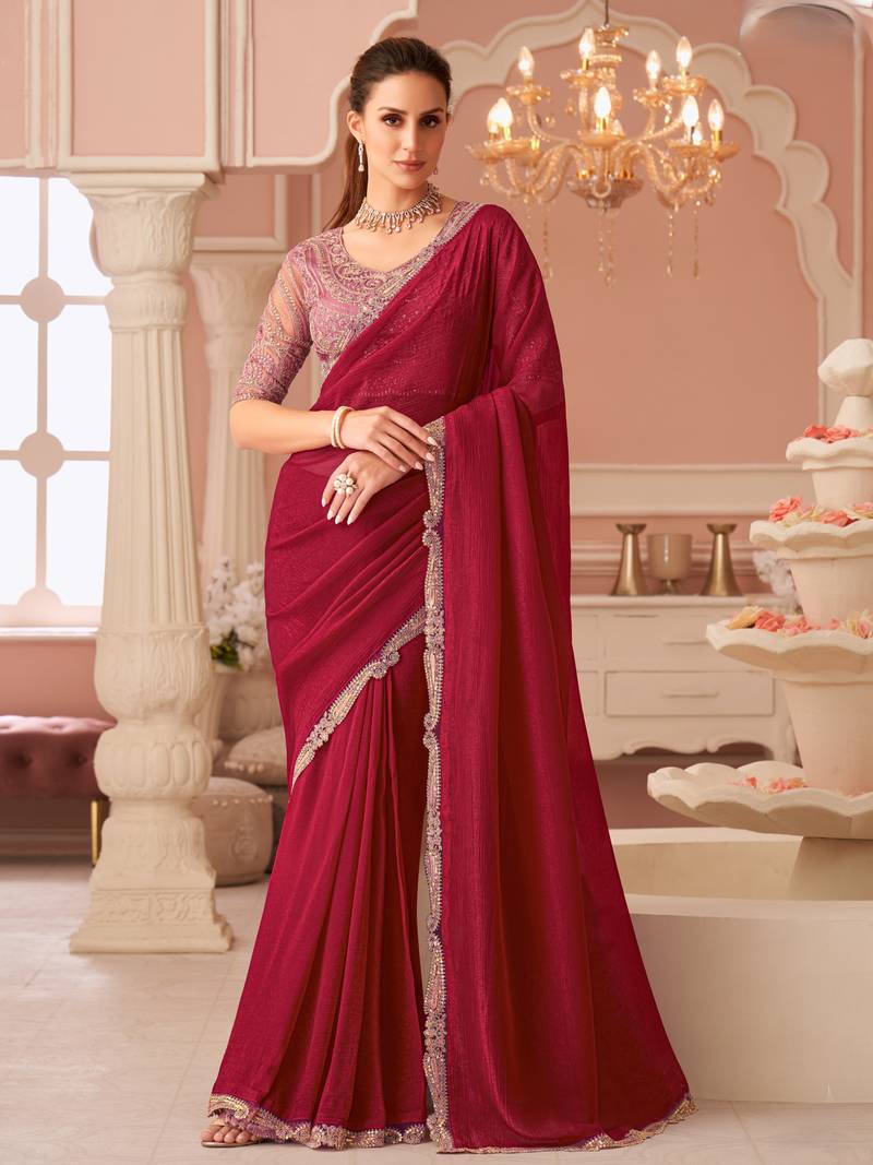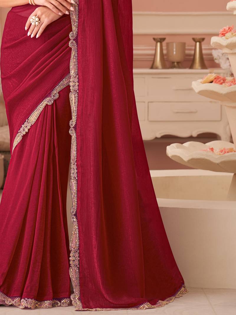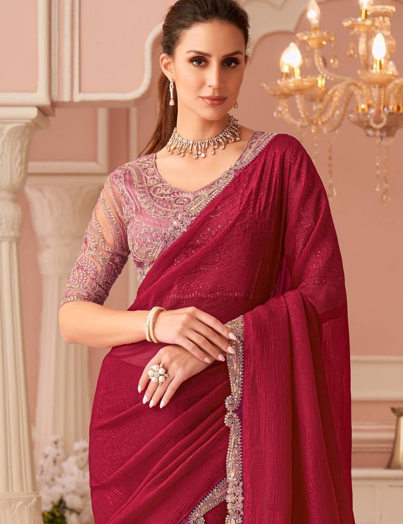 Cherry red georgette designer lace border saree with heavy work blouse for wedding party