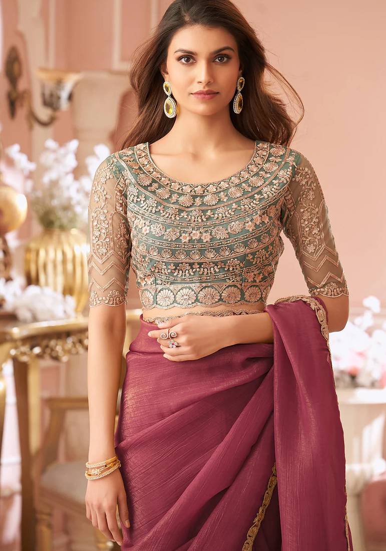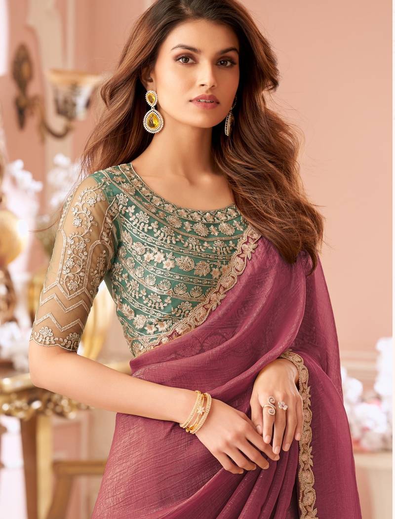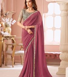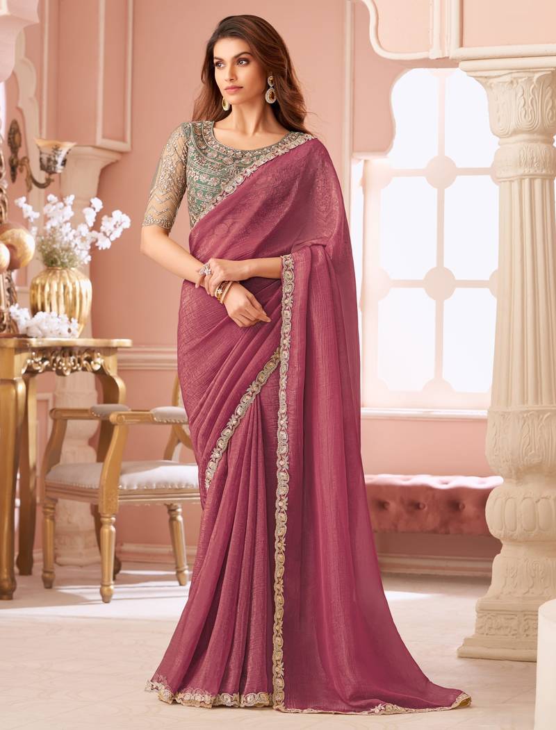 Dark pink georgette saree with heavy embroidered blouse and designer lace border for weddings & special occasions