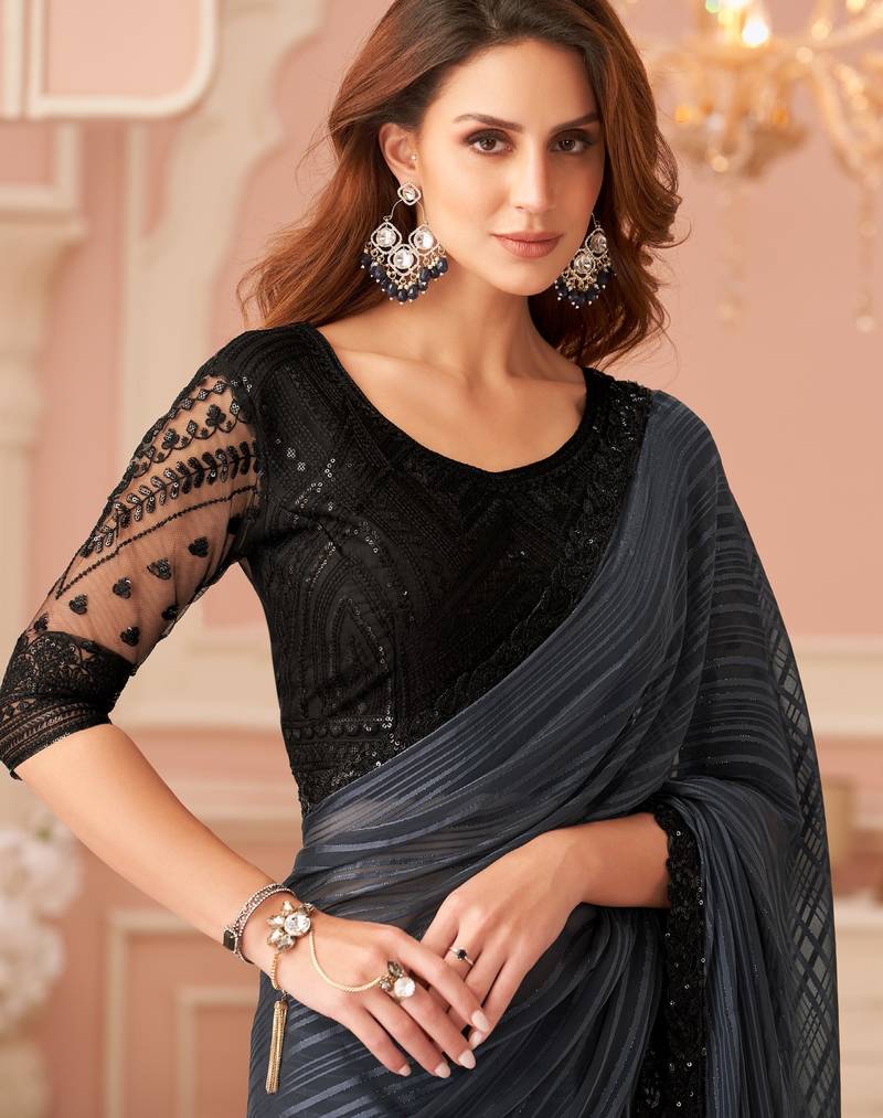Grey georgette designer lace border saree with heavy work blouse for wedding party