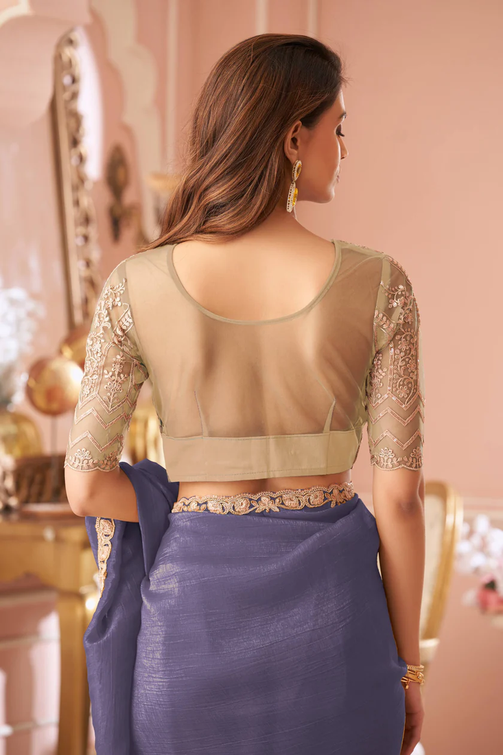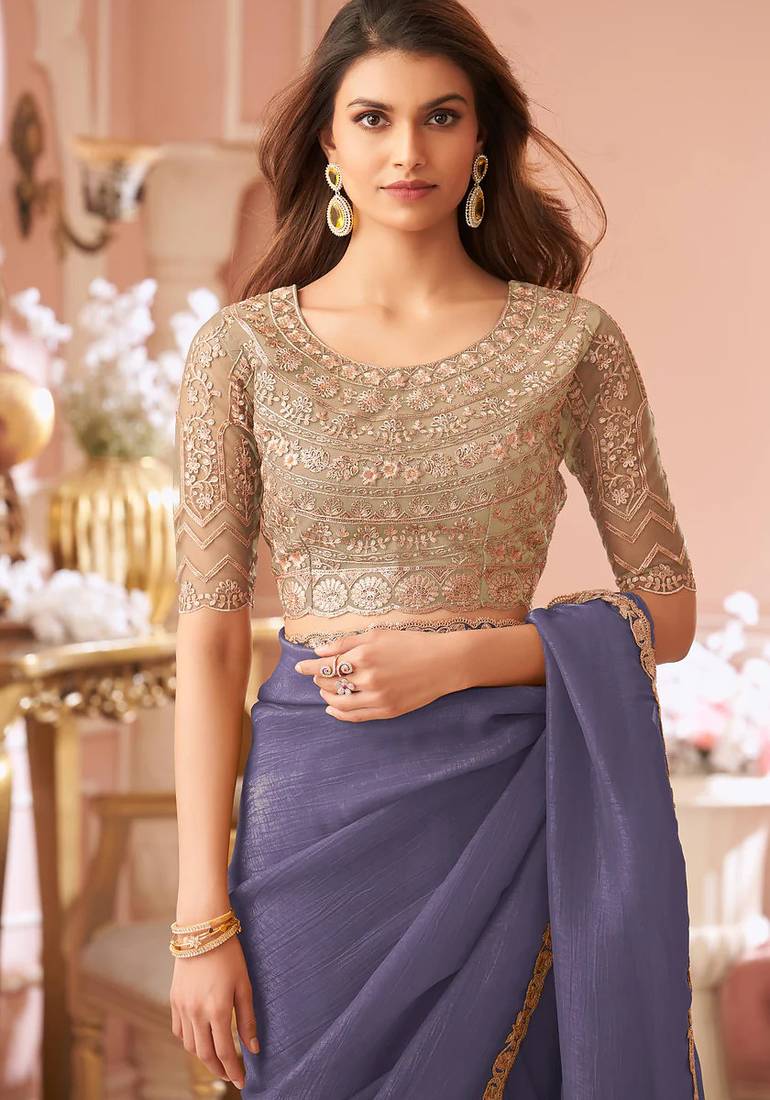 Light indigo georgette saree with heavy embroidered blouse and designer lace border for weddings, festive