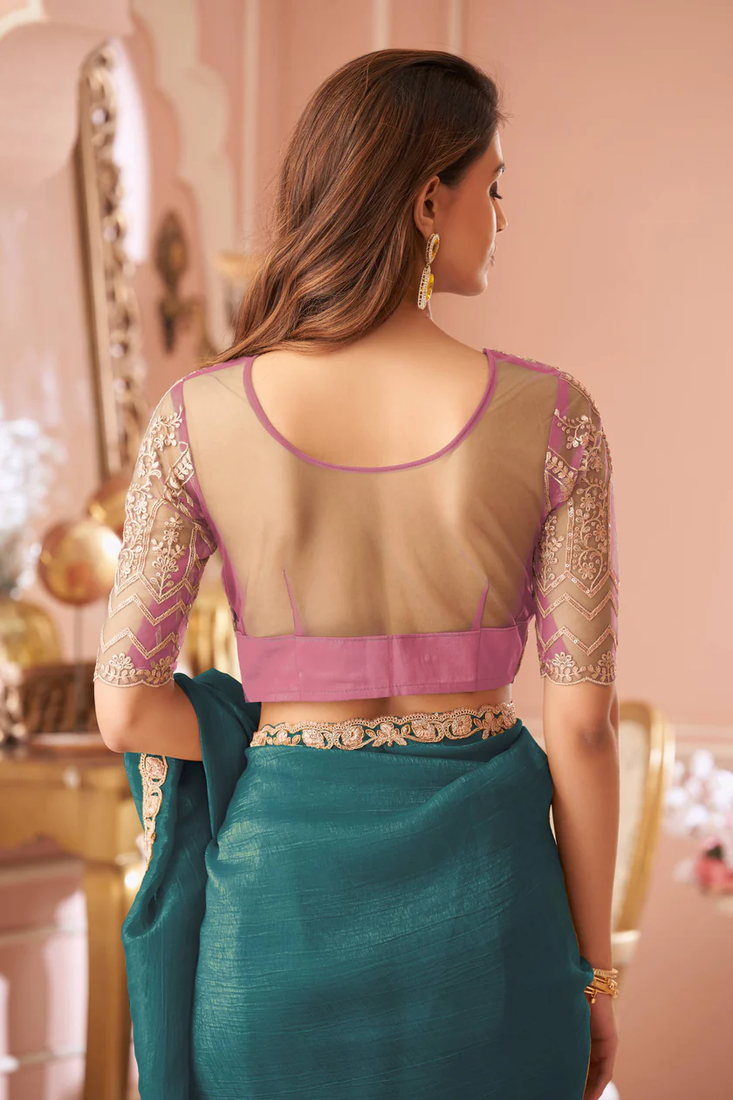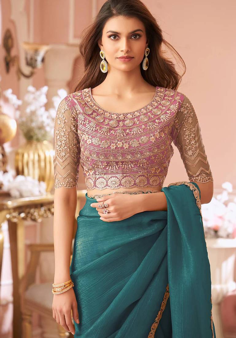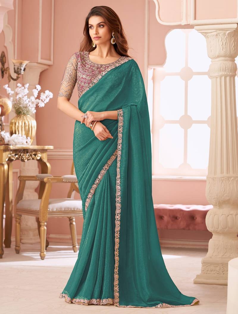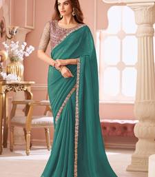Teal green georgette saree with heavy embroidered blouse and lace border for weddings, festive & special occasions