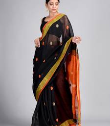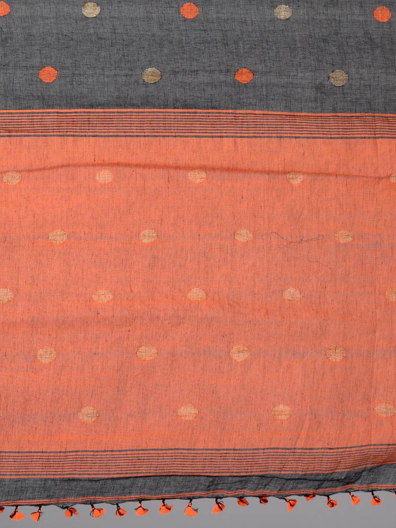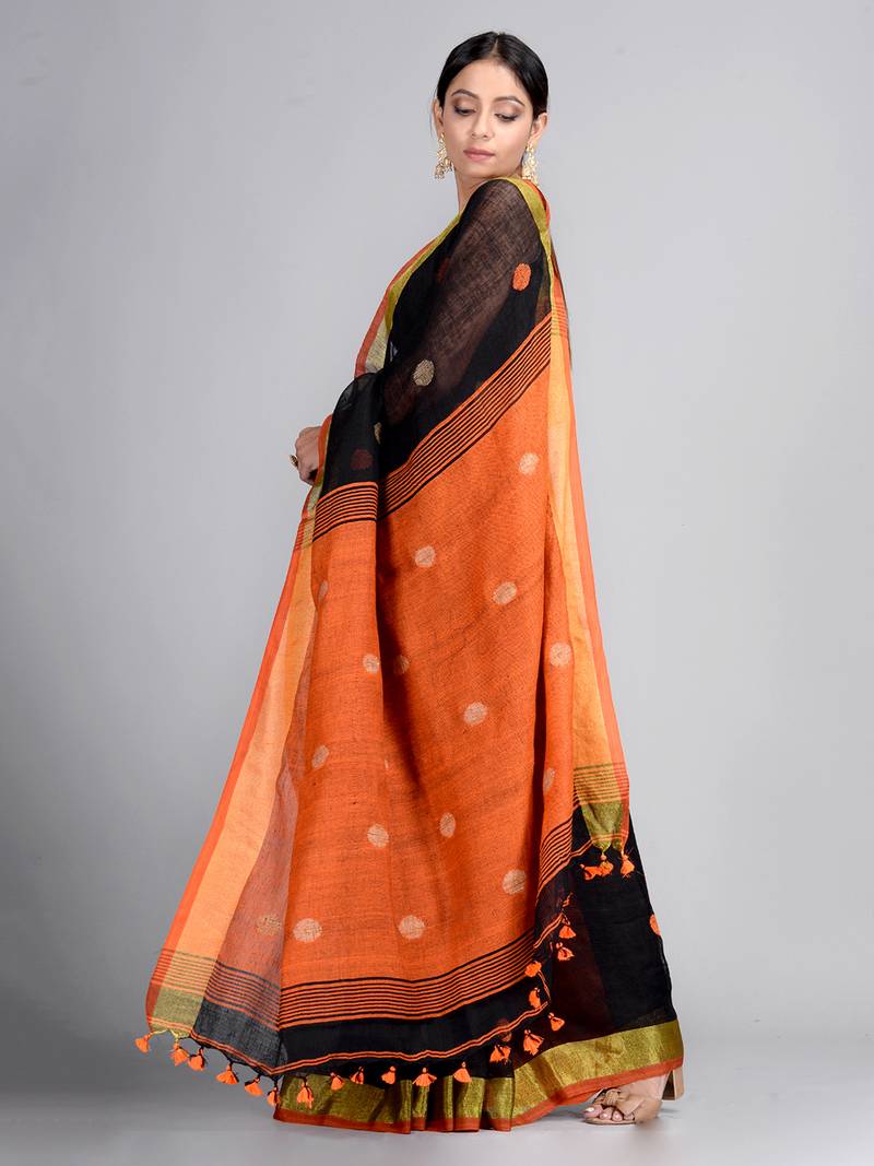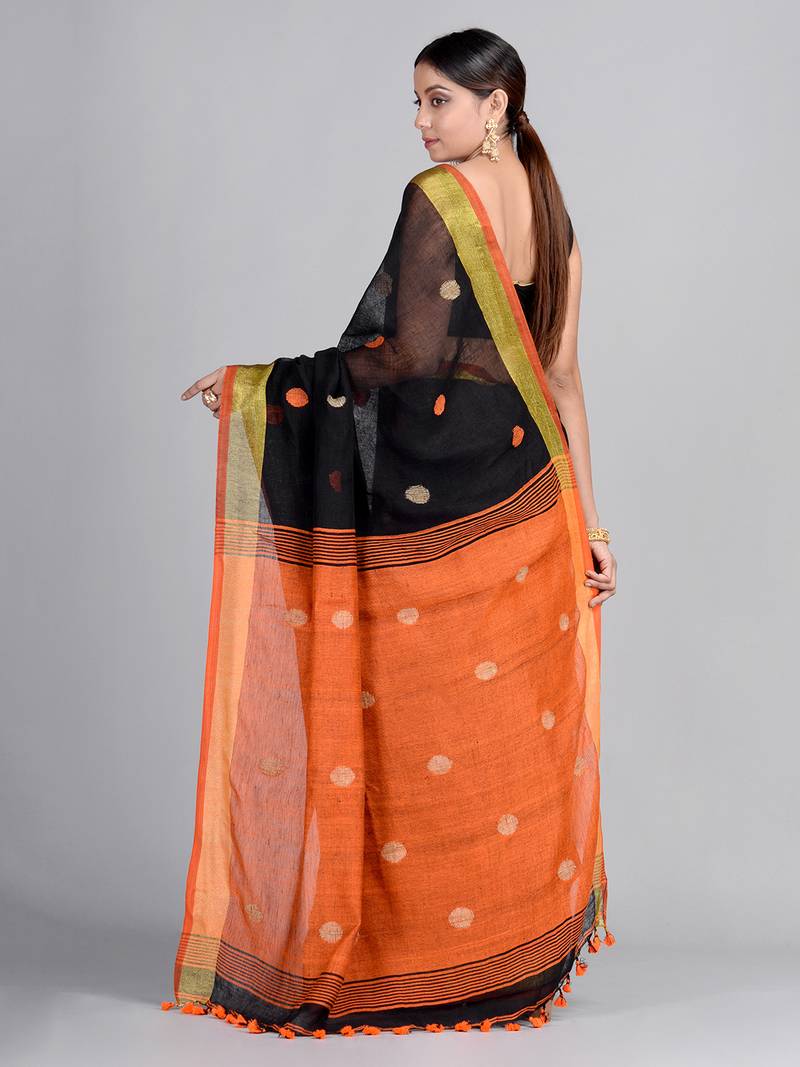 | Product Description | Black And Orange Hand Woven Linen Saree With Polka Dots |