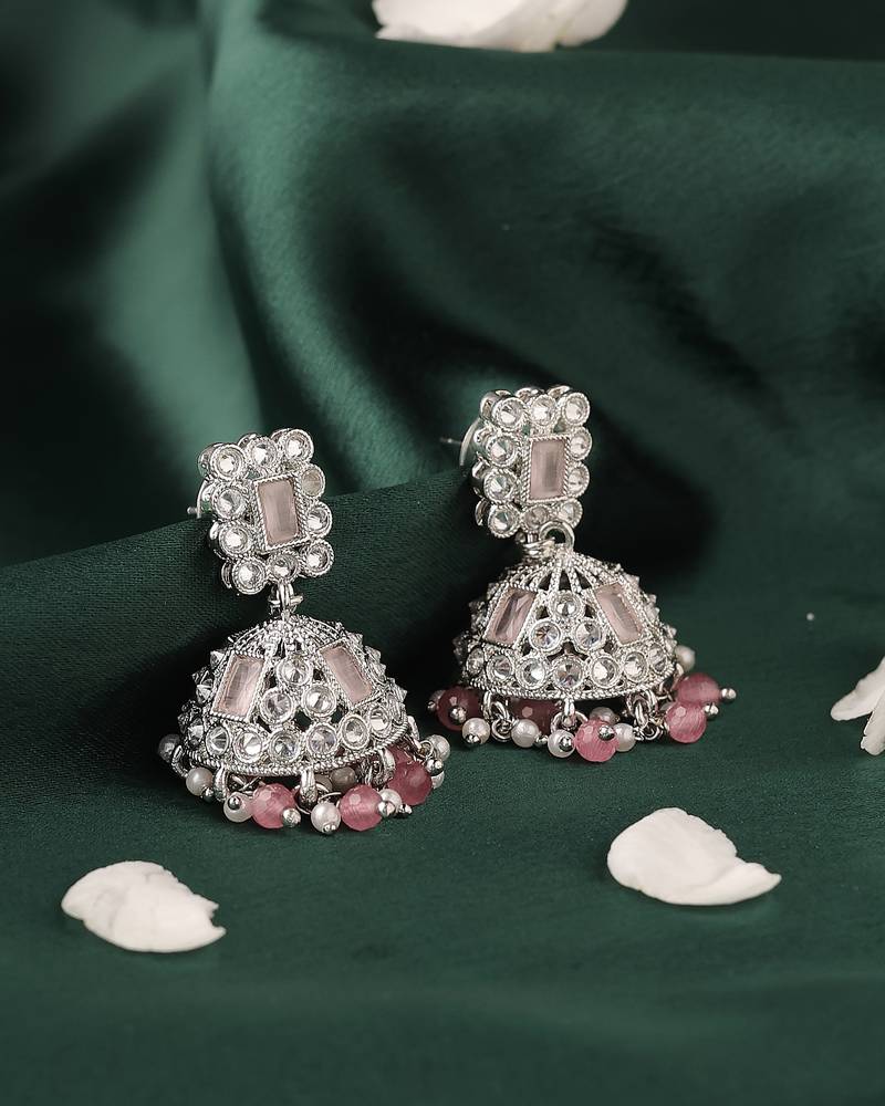 Dazzling square shape silver plated pink kundan stone jhumki earring for women and girls