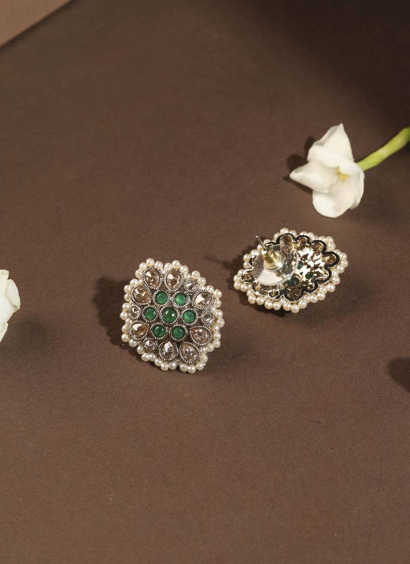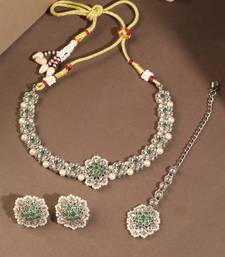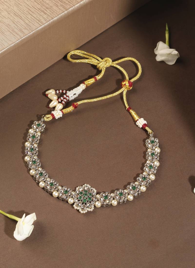 | Product Description | This Saloni Fashion Jewellery Pretty Flower Shape Pearl Green Kundan Stone Antique Gold Plated Choker Necklace Set With Maang Tikka For Women And Girls Is Made Of Alloy Will Give You Astonishing Charm And Super Comfort.