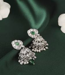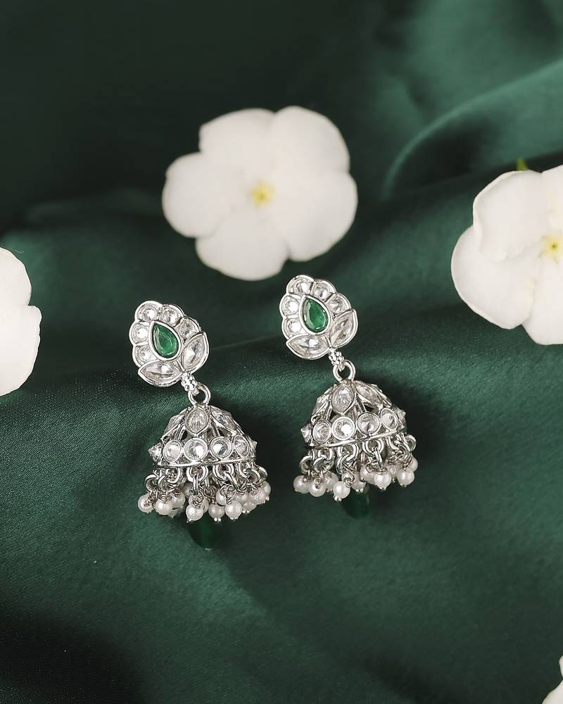 Lavish leaf and pear shape silver plated green kundan stone brass jhumki earring for women and girls