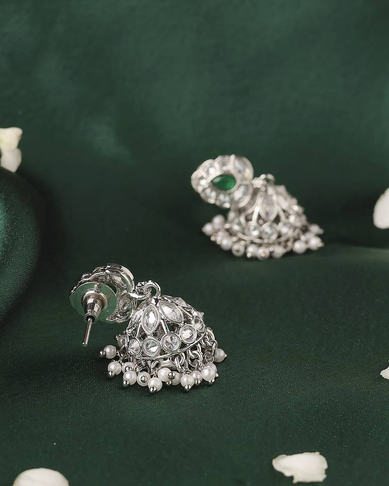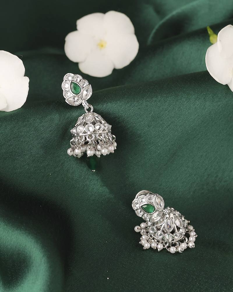 Product Name | Lavish Leaf And Pear Shape Silver Plated Green Kundan Stone Brass Jhumki Earring For Women And Girls | |