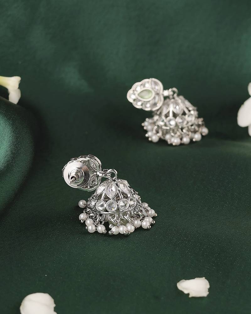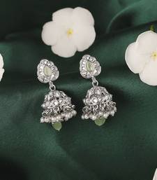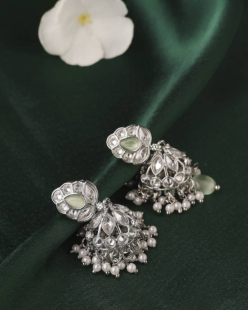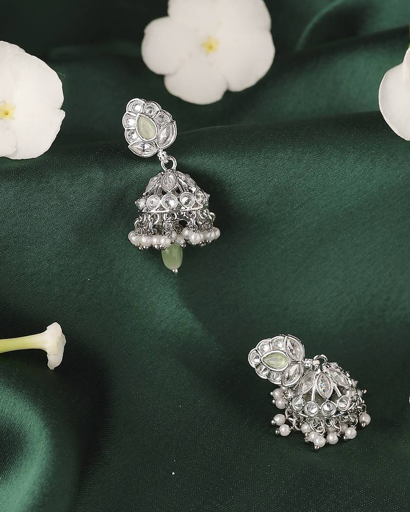 Leaf and pear shape silver plated light green kundan stone brass jhumki earring for women and girls