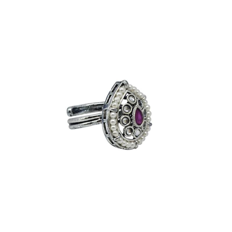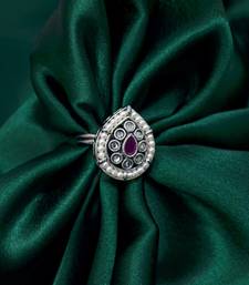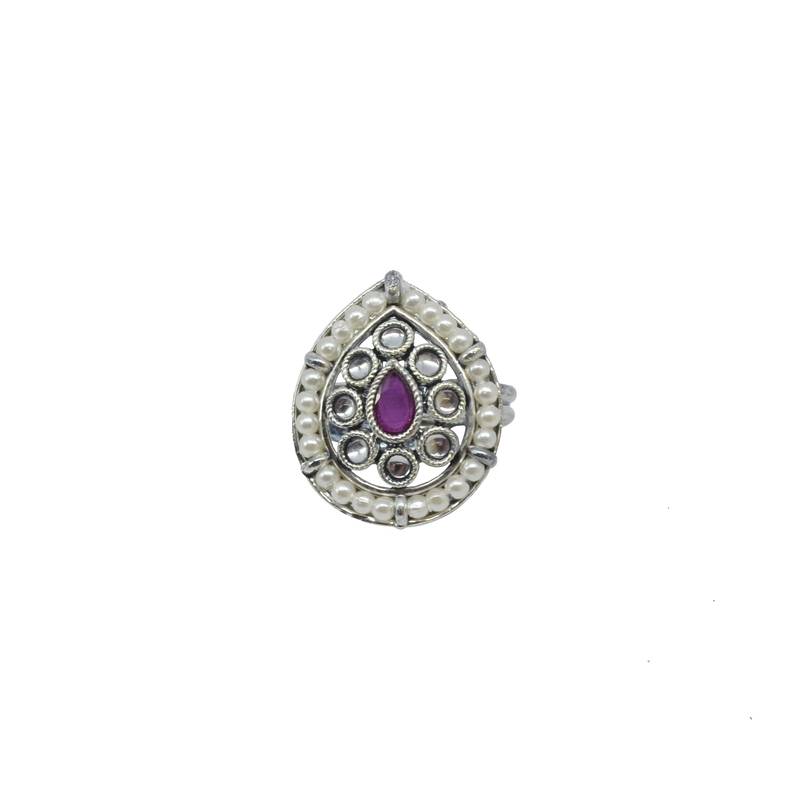 Pear shape and mother of pearl silver plated kundan stone adjustable finger ring for women and girls