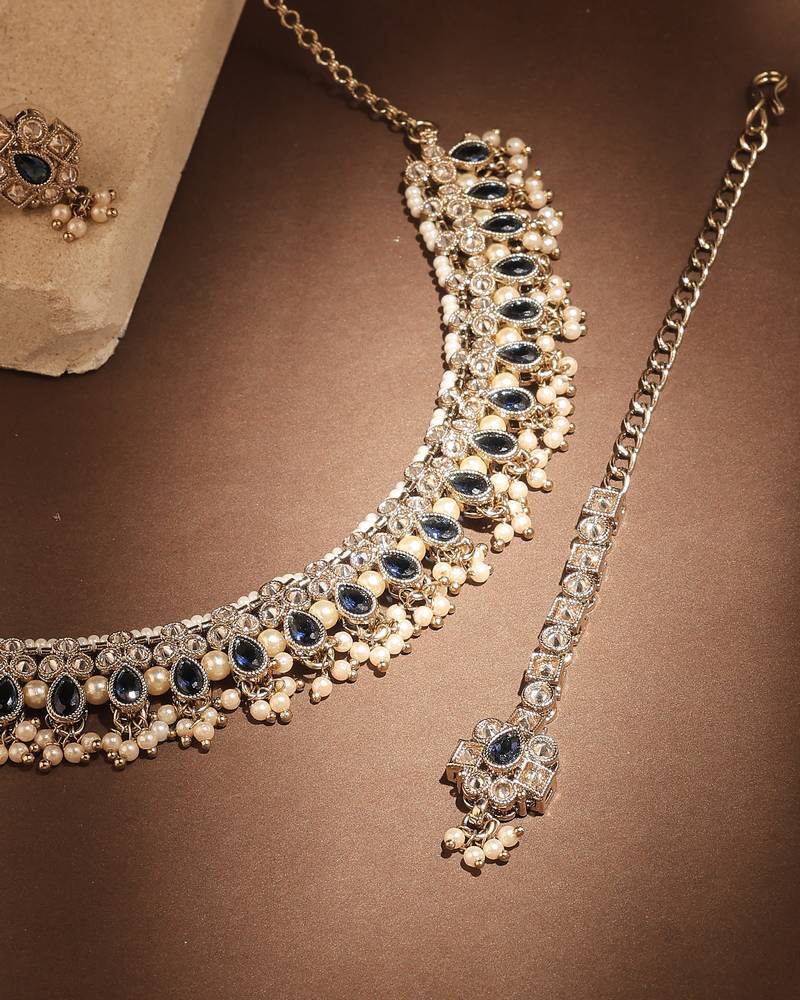 Product Description | This Saloni Fashion Jewellery Lavish Pear Shape Pearl Guchha Antique Gold Plated Blue Uncut Kundan Stone Choker Necklace Set With Maangtikka For Women And Girls Is Made Of Alloy Will Give You Astonishing Charm And Super Comfort.