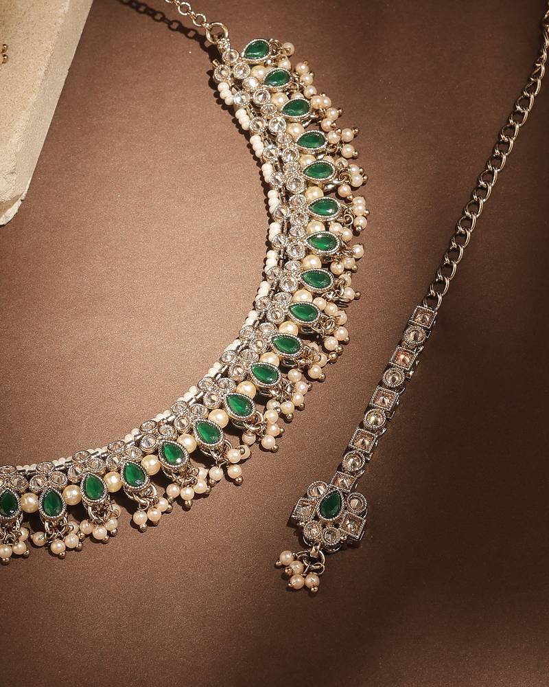 Product Description | This Saloni Fashion Jewellery Glamorous Pear Shape Pearl Guchha Antique Gold Plated Green Uncut Kundan Stone Choker Necklace Set With Maangtikka For Women And Girls Is Made Of Alloy Will Give You Astonishing Charm And Super Comfort.