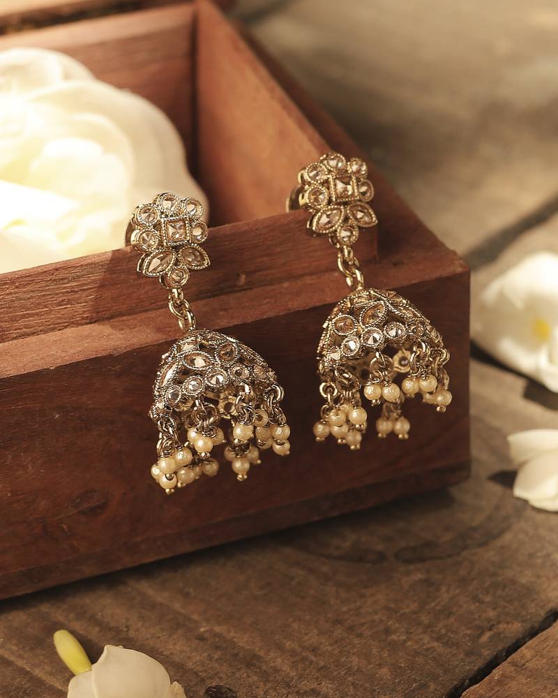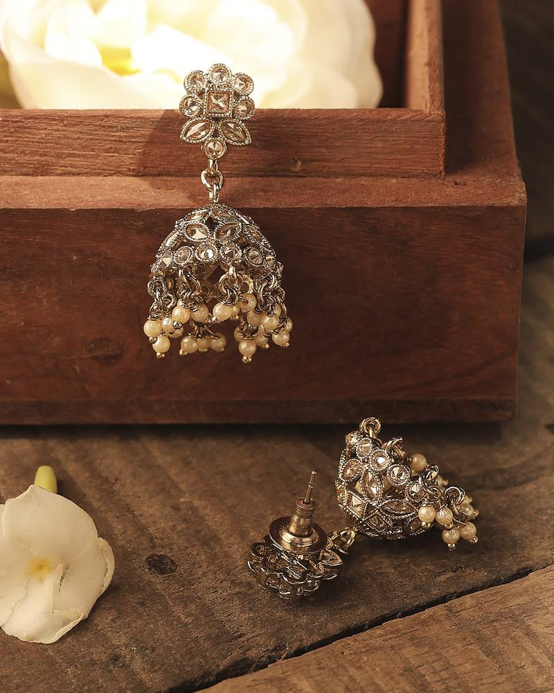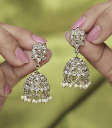 Round and pear shape silver plated pearl brown kundan stone jhumki earring for women and girls