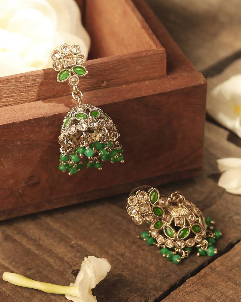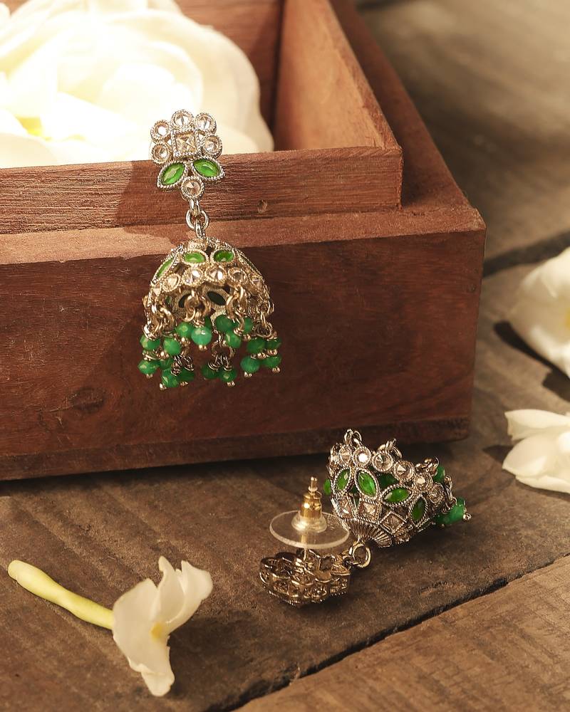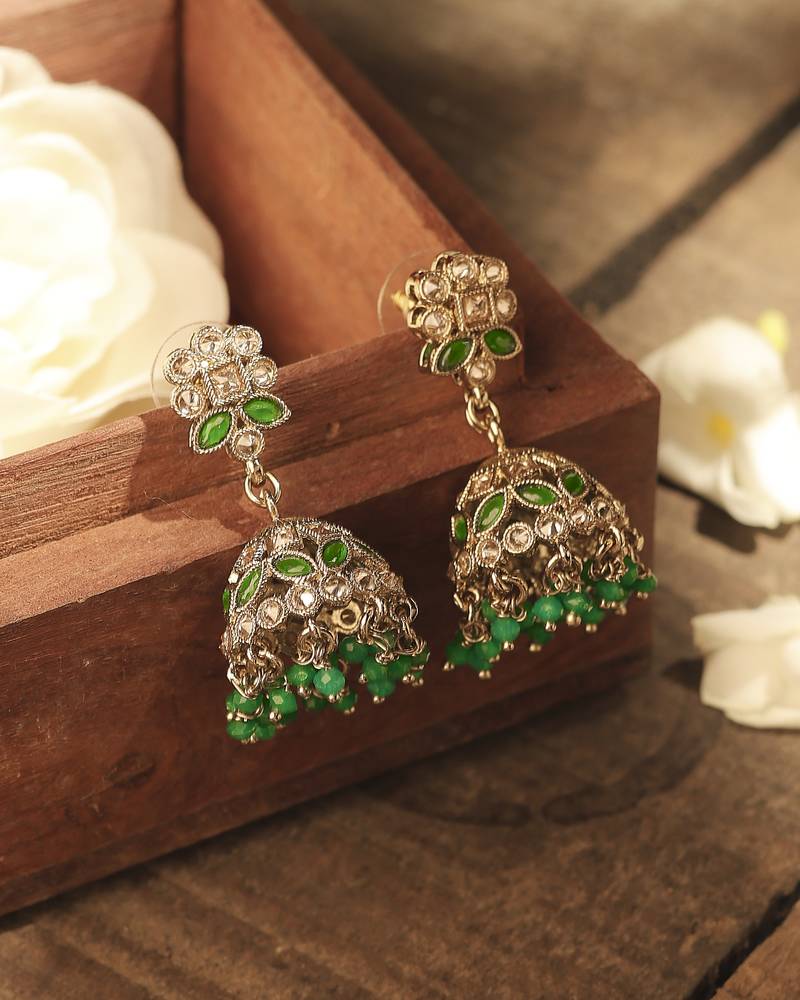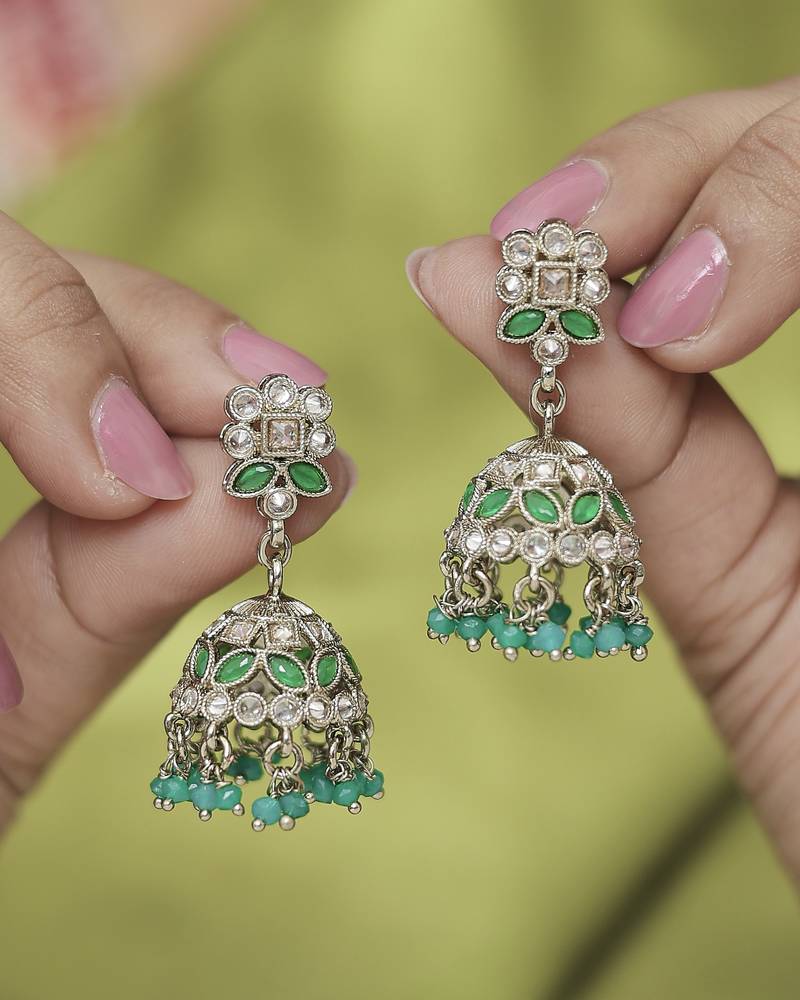 Round and pear shape silver plated pearl green kundan stone jhumki earring for women and girls