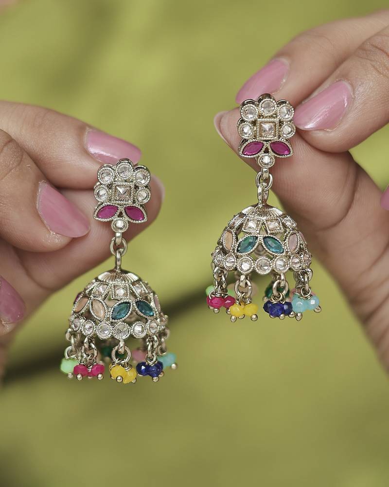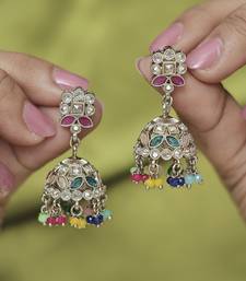 Round & pear shape silver plated pearl multi kundan stone jhumki earring for women & girls