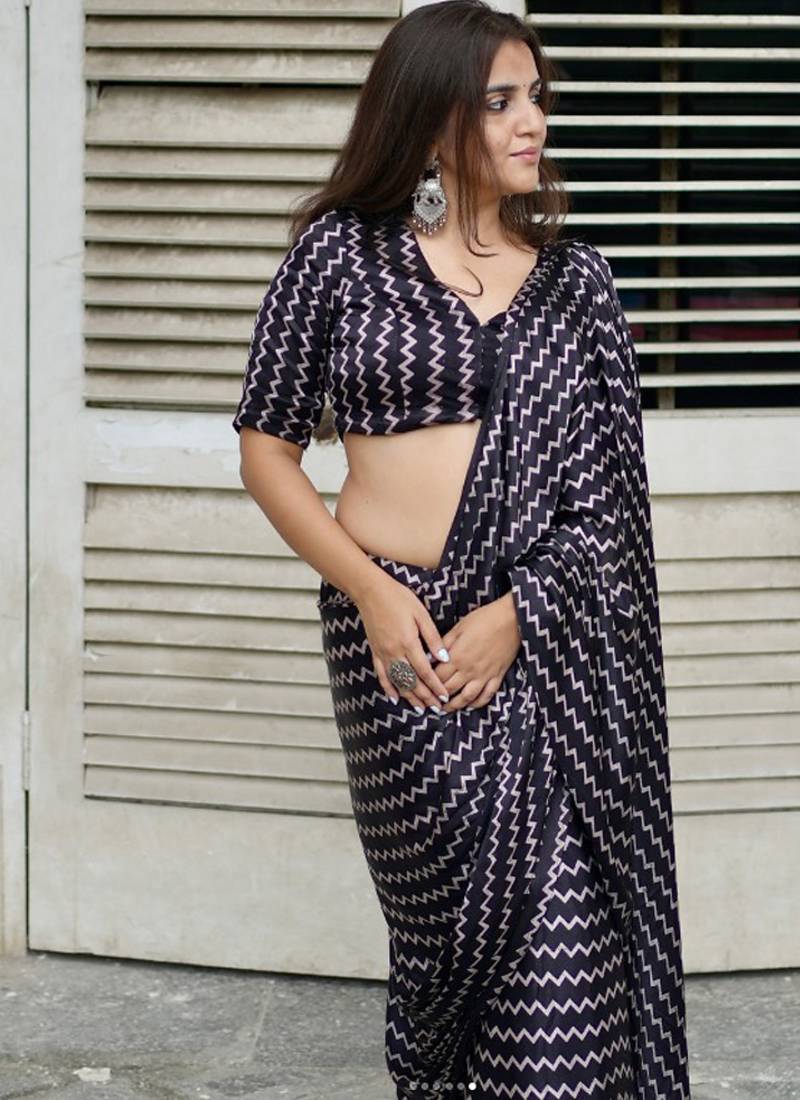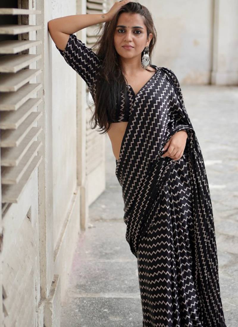 | Product Description | Soft Satin Saree Crafted With Zigzag Pattern All Over. Saree Comes With Unstitched Printed Satin Blouse Piece. Note: Slight Variation In Color Is Possible Due To Photographic Flash Light Effect |