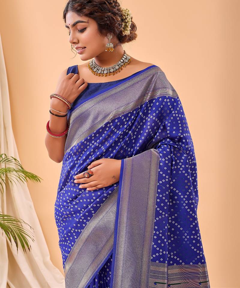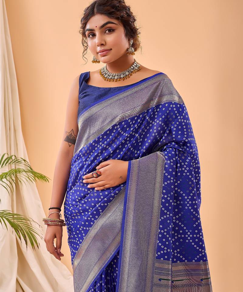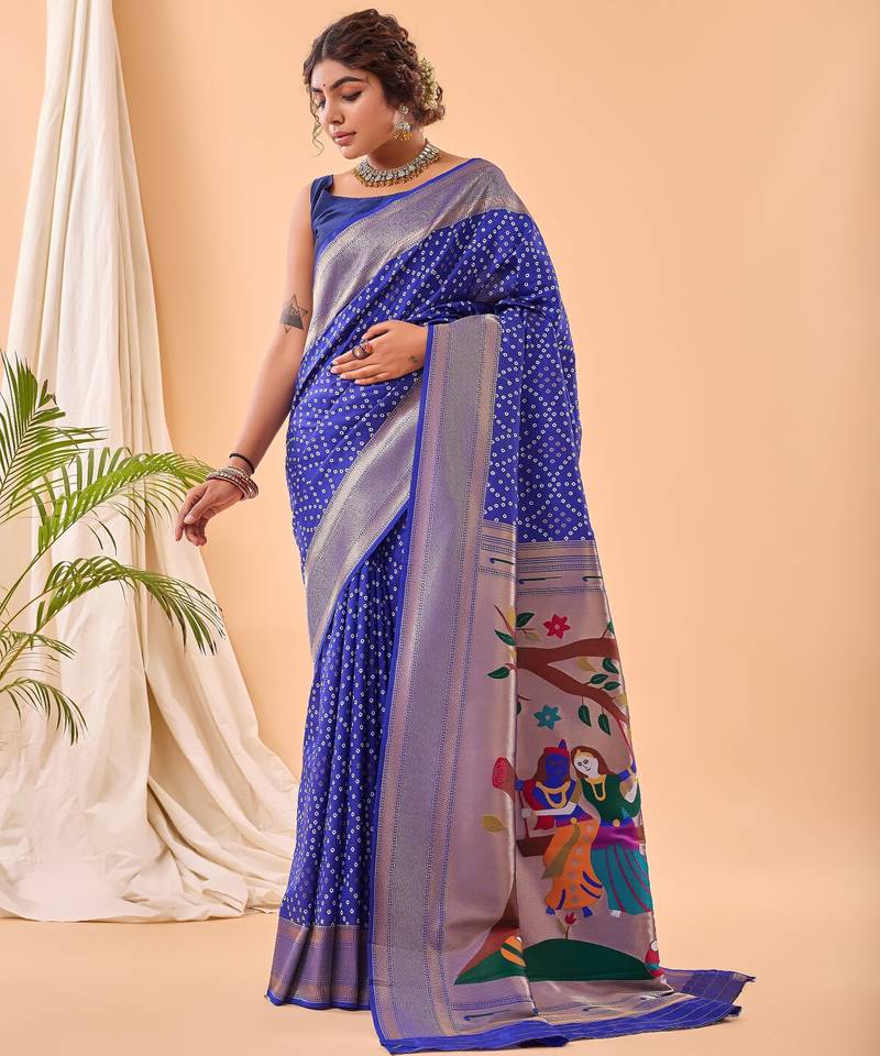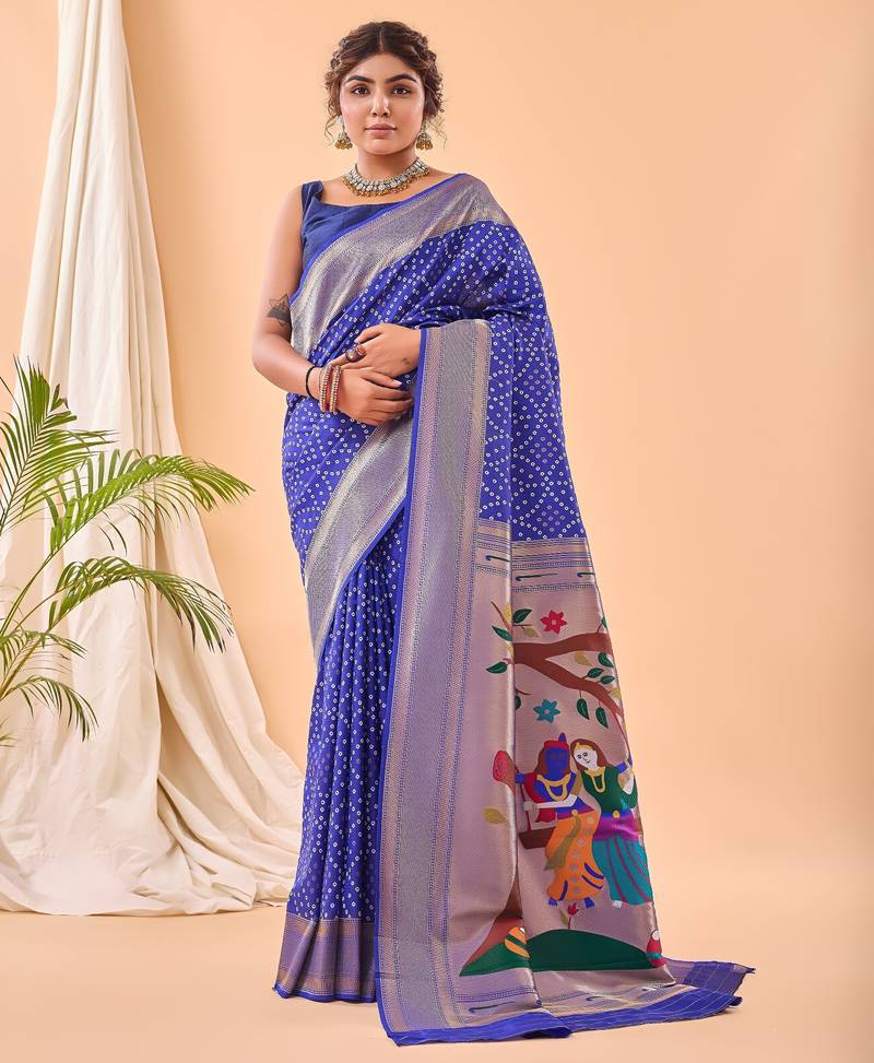 Product Description | Graceful Heavy Bandhani Saree Enhanced With Paithani Weaving On The Pallu And Borders. Styled With A Complementing Brocade Blouse For Timeless Ethnic Charm. Note: Blouse Wore By Model Is For Shooting Purpose Only, It Might Differ In Actual |