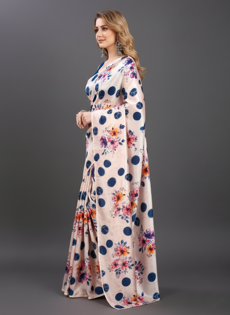 Cream printed satin saree with blouse piece