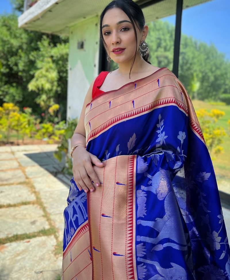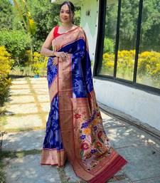 Dark blue woven paithani silk saree with blouse piece