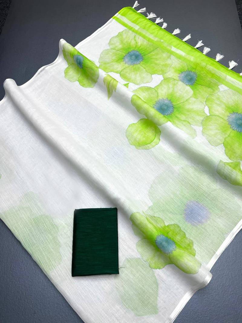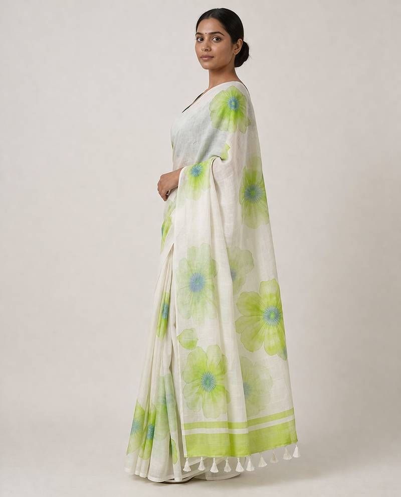 | Product Description | Elegant Linen Woven Saree Crafted With Floral Print. Saree Comes With Unstitched Linen Printed Blouse Piece. Note: Please Refer Real Image Attached |