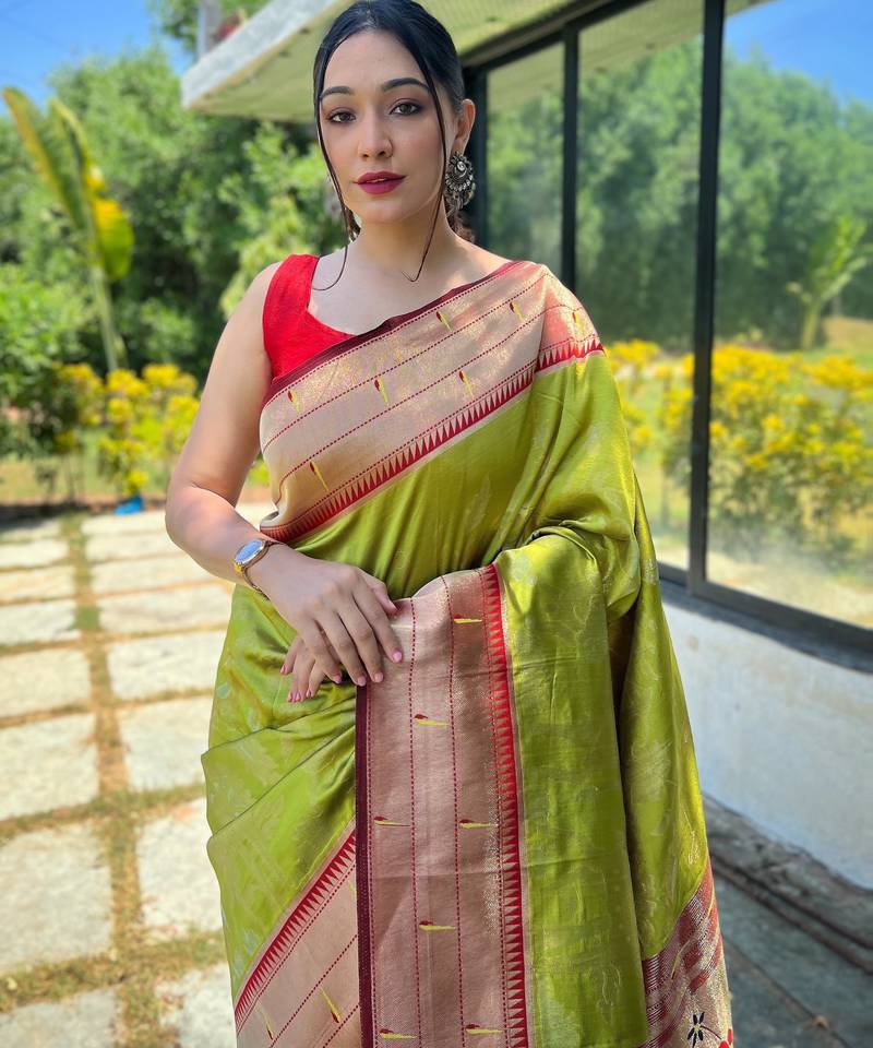 Green woven paithani silk saree with blouse piece