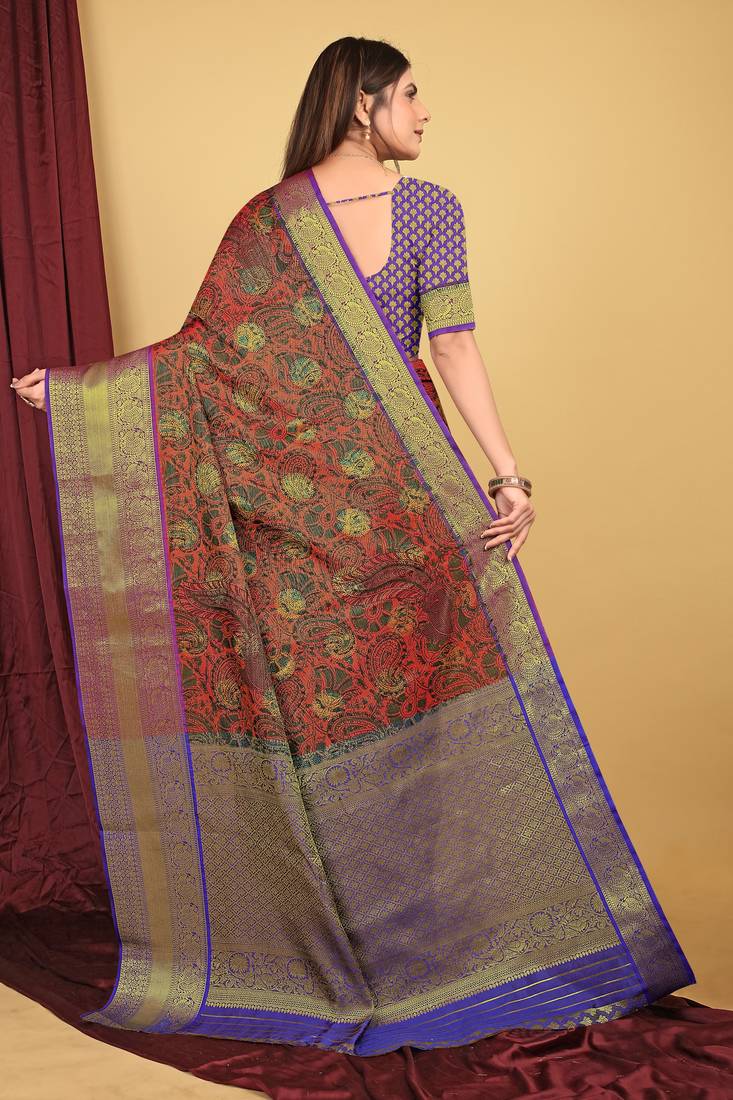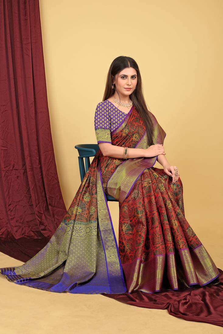| Product Description | Pattu Silk Saree Crafted With Kalamkari Digital Print With Emboss Jari Weaving Contrast Pallu. Saree Comes With Brocade Silk Blouse Piece |