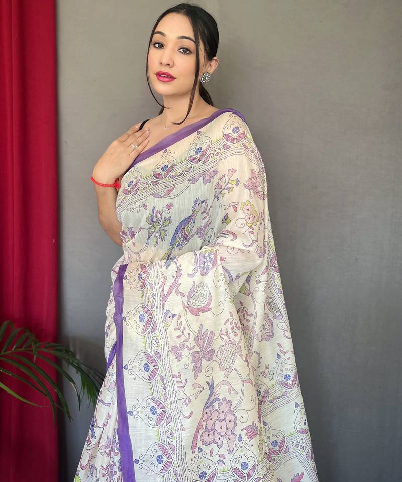 Product Description | Beautiful Malai Cotton Saree Featuring All Over Katha Print Concept, Styled With A Matching Katha Print Pallu And Contrast Border. Paired With A Beautifully Printed Blouse For A Complete Look. Note: Blouse Wore By Model Is For Shooting Purpose Only, It Might Differ In Actual |