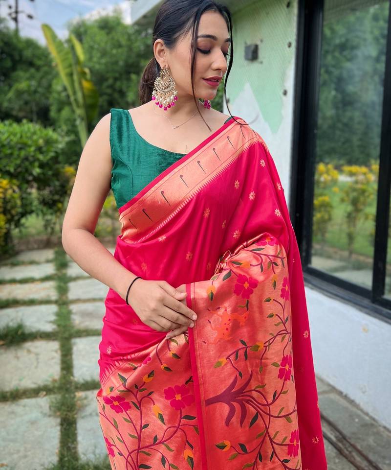 Pink woven paithani silk saree with blouse piece