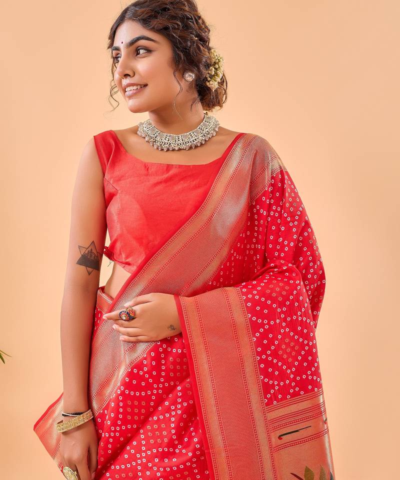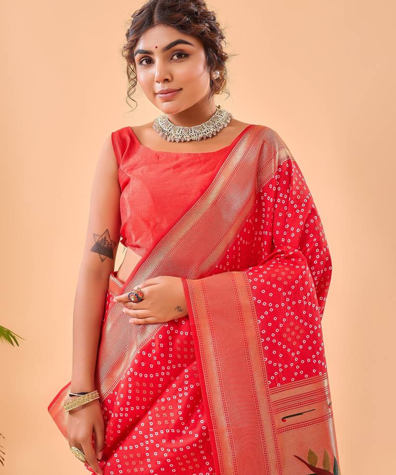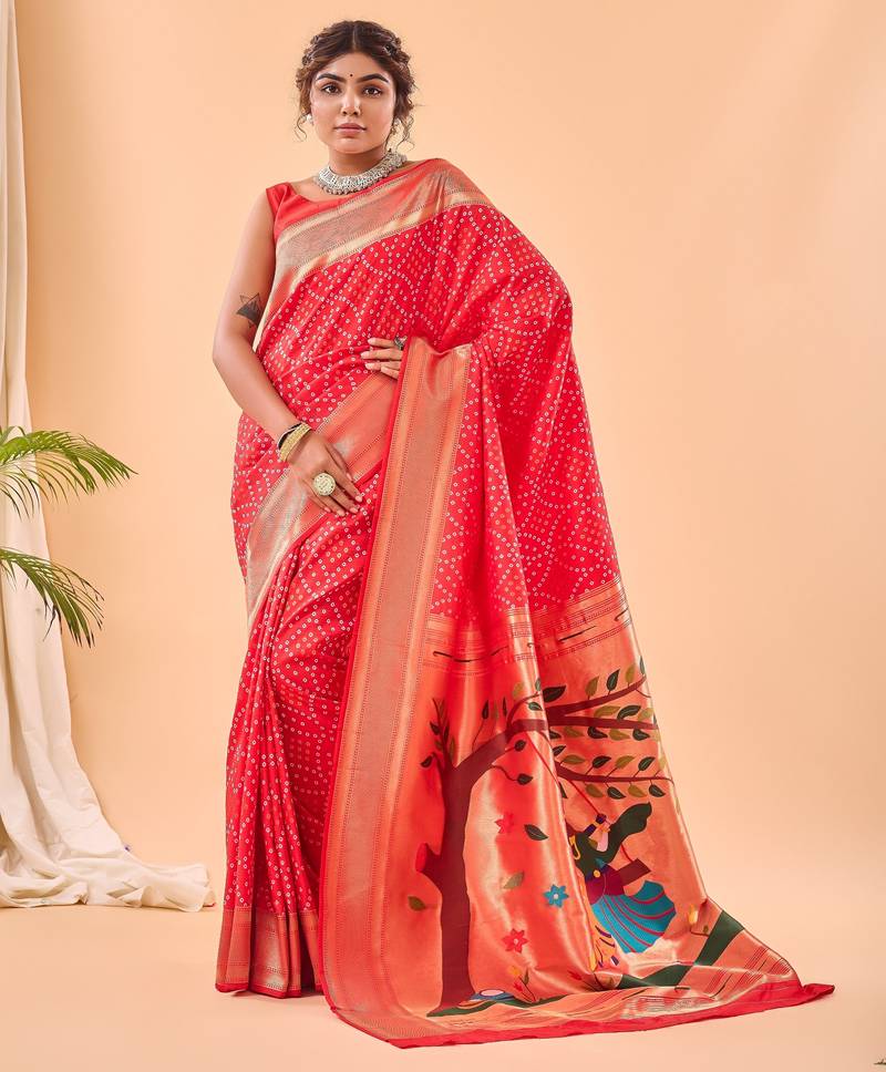 Product Description | Traditional Bandhani Weaving Saree Crafted With Paithani Inspired Pallu And Elegant Double Side Borders. Comes With A Brocade Blouse To Complete The Rich Ensemble. Note: Blouse Wore By Model Is For Shooting Purpose Only, It Might Differ In Actual |