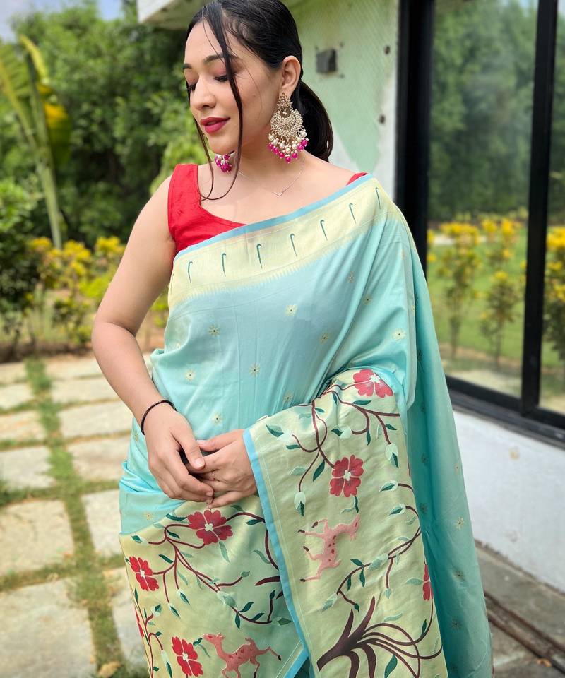 Sky blue woven paithani silk saree with blouse piece