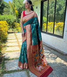 Turquoise woven paithani silk saree with blouse piece