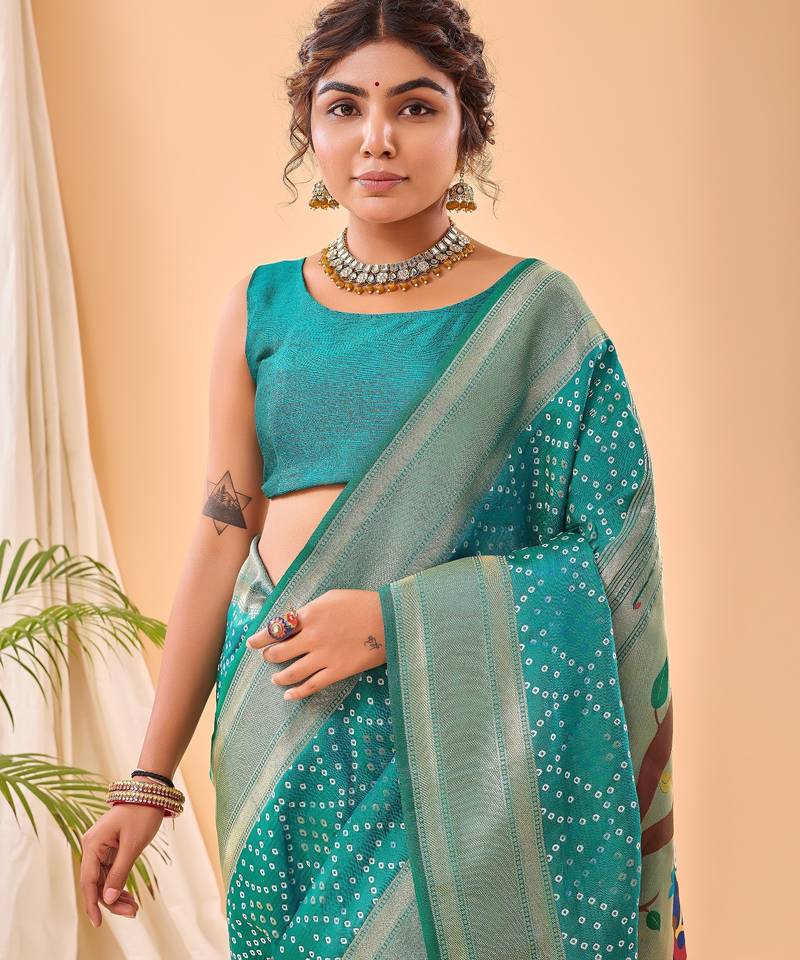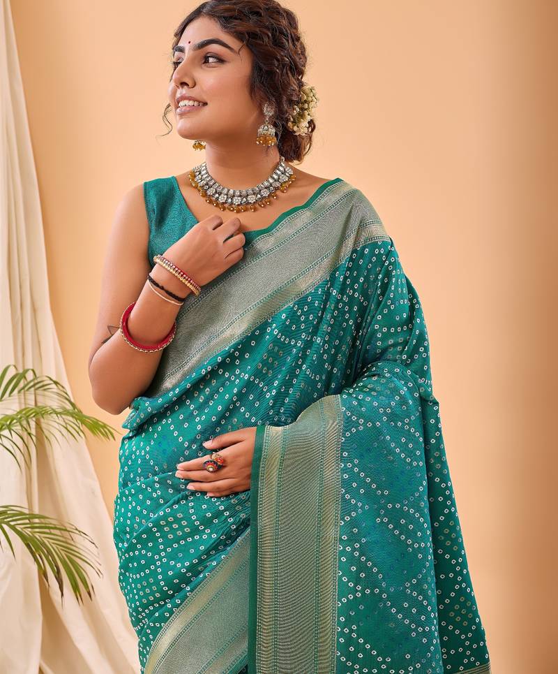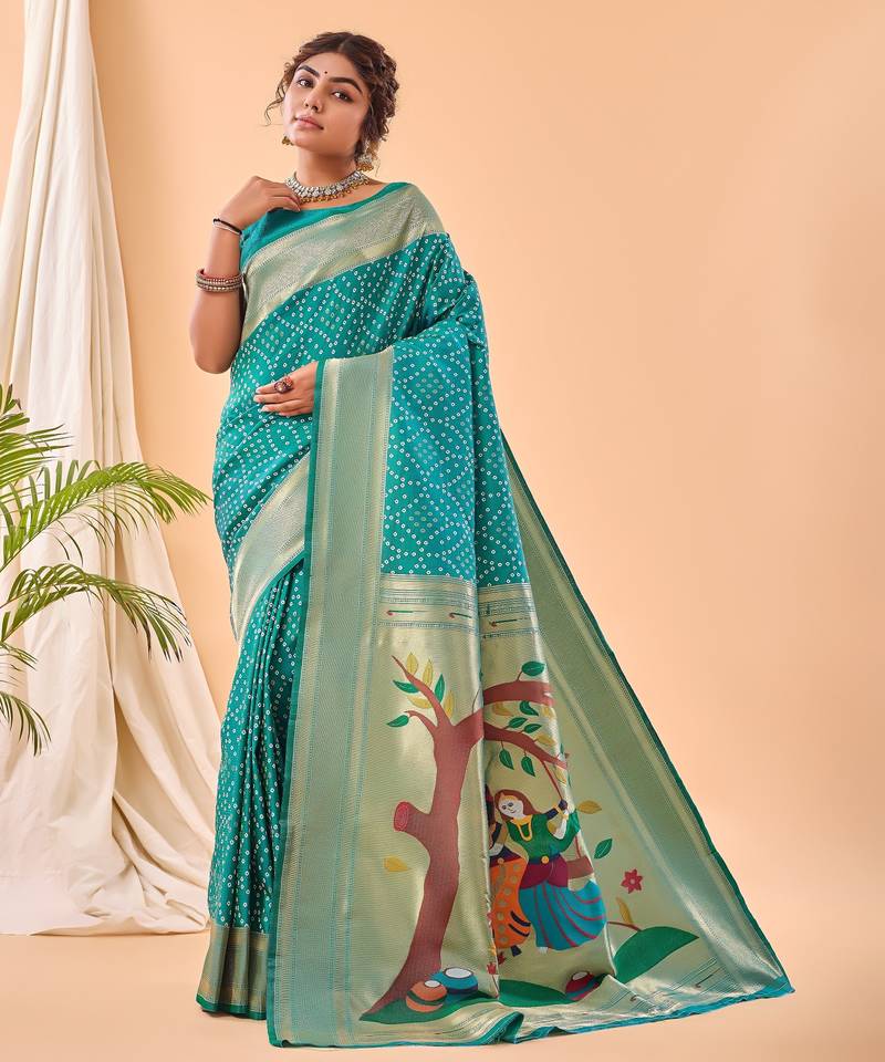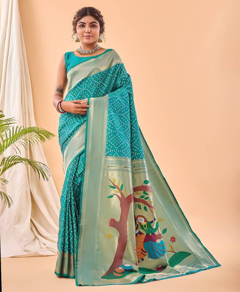 Product Description | Elegant Heavy Bandhani Weaving Saree Beautifully Designed With Paithani Pallu And Borders On Both Sides. Paired With A Rich Brocade Blouse For A Complete Festive Look. Note: Blouse Wore By Model Is For Shooting Purpose Only, It Might Differ In Actual |