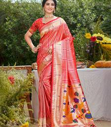 Coral pink silk blend woven work traditional saree