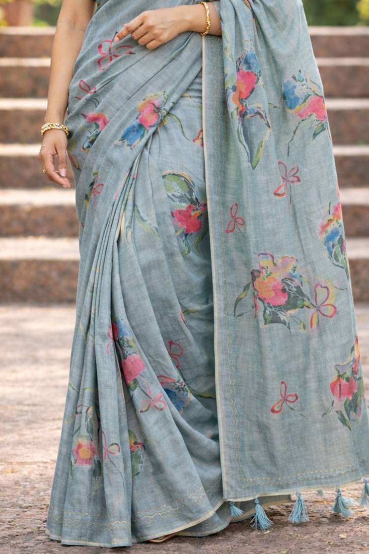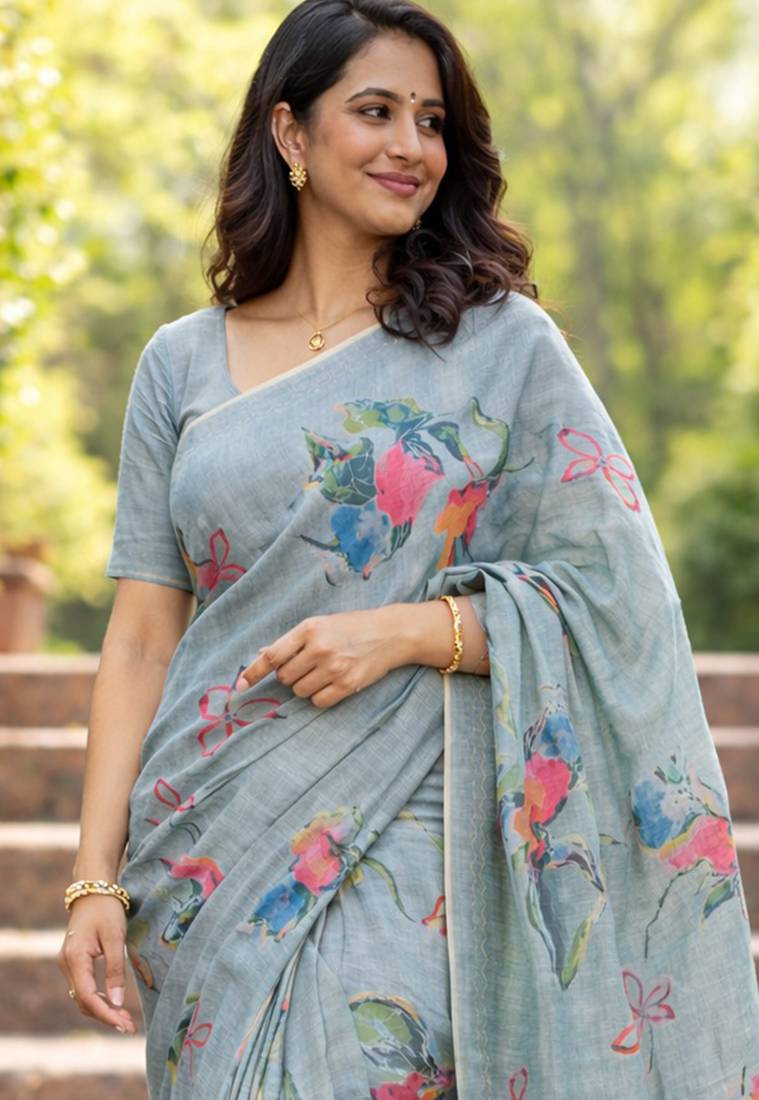 | Product Name | Sangam Prints Grey Cotton Print With Aari Work Woven Work Traditional Saree | |