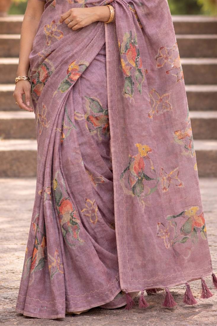 | Product Name | Sangam Prints Purple Cotton Print With Aari Work Woven Work Traditional Saree | |