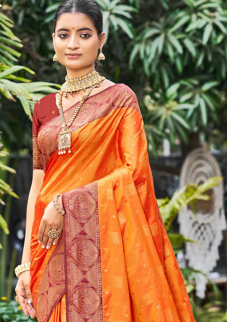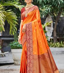 Saffron orange soft silk woven work traditional saree
