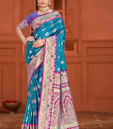 Teal blue satin silk woven work traditional saree