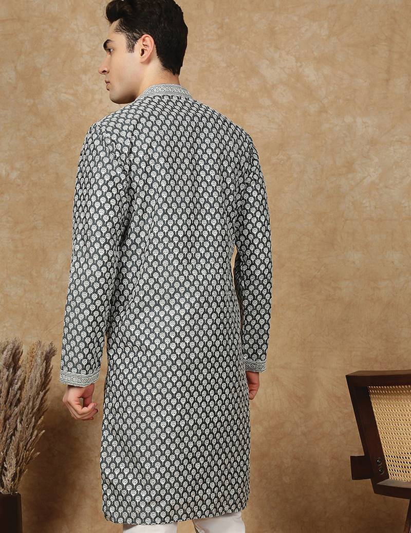 Black cotton floral kurta for men