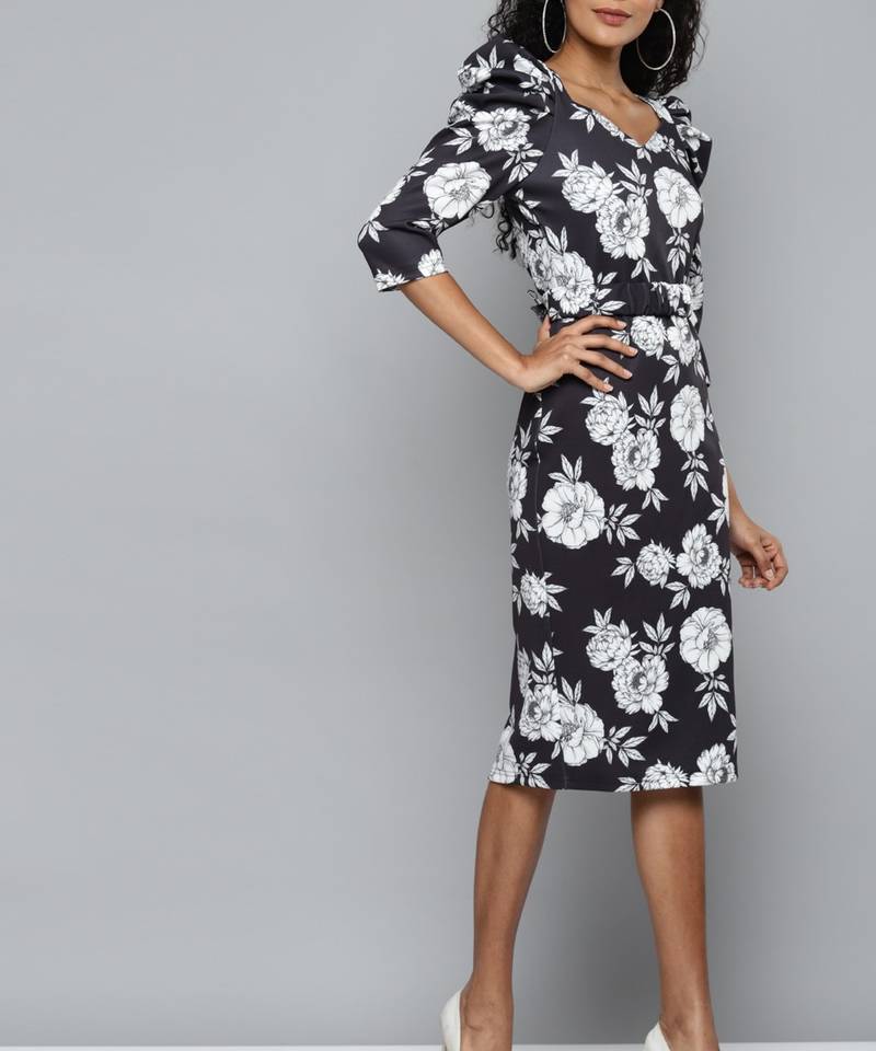 | Product Description | Black Floral Scuba Power Shoulder Midi Dress, In Scuba Fabric, Unlined, Midi Length, Slim Fit, Zipper Closure, Straight Hemline And Features Rouched Belt At Waist |