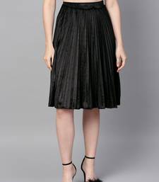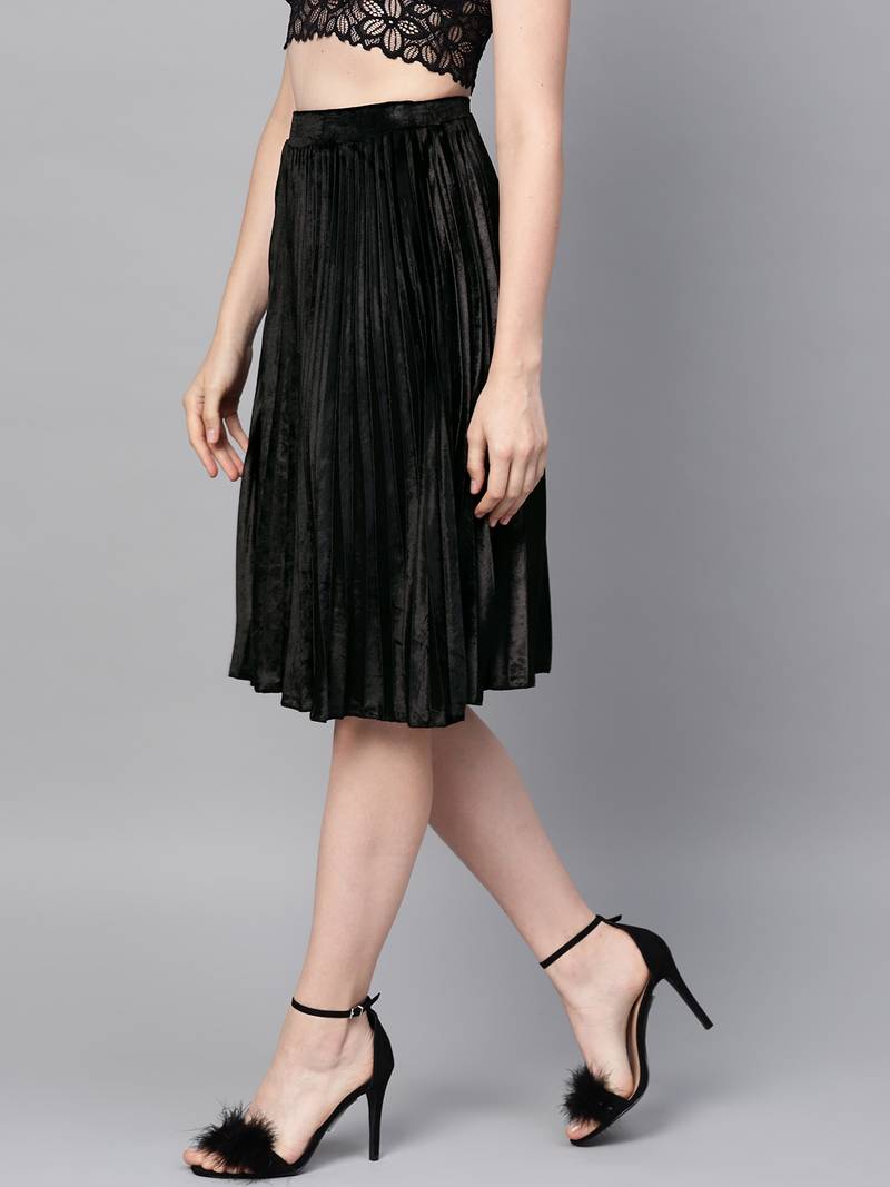 | Product Description | Black Velvet Pleated Skirt, In Velvet Fabric, Unlined, Knee Length, Comfort Fit, Elastic At Waist, Flared Hemline And Features Pleated A Line Skirt |